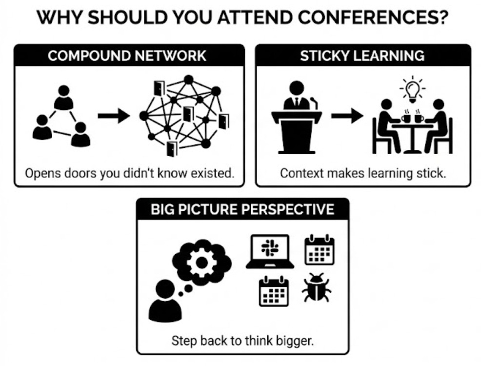 Conferences are one of the few times you can legitimately step back from the daily grind and think bigger. You’re not in Slack. You’re not in your 1:1s. You’re not triaging bugs. You’re surrounded by people solving similar problems at different companies. That perspective is worth the flight.