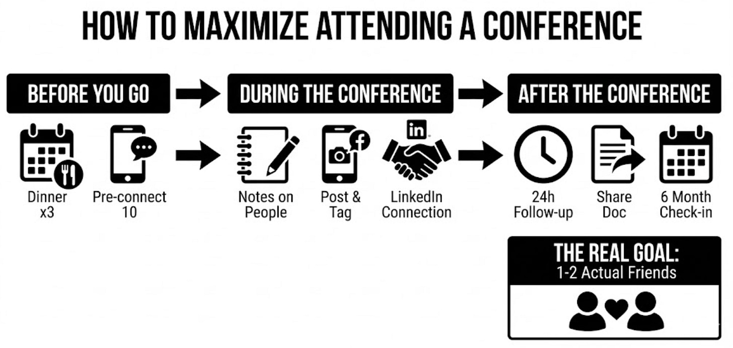Most people do conferences wrong. They sit in sessions, take notes they’ll never read, collect business cards that end up in a drawer, and fly home thinking “that was nice.”