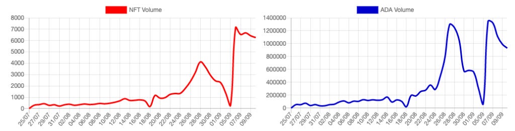 Everything started to take off. Japan authorized Ada at its exchanges. In addition, NFTs really started to take off on the Cardano blockchain, following the rise on Ethereum earlier this year. Just look at this trading volume: