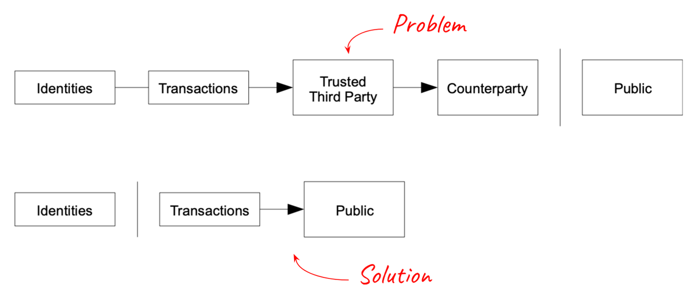 Bitcoin solves this trust problem that causes economy participants to have to rely on these institutions. With bitcoin, transactions are publicly announced. There is a system for participants to agree on a single history of the order in which they were received. Identities are not necessary. Supply is capped. As a result, it is a system for electronic transaction entirely without relying on trust: