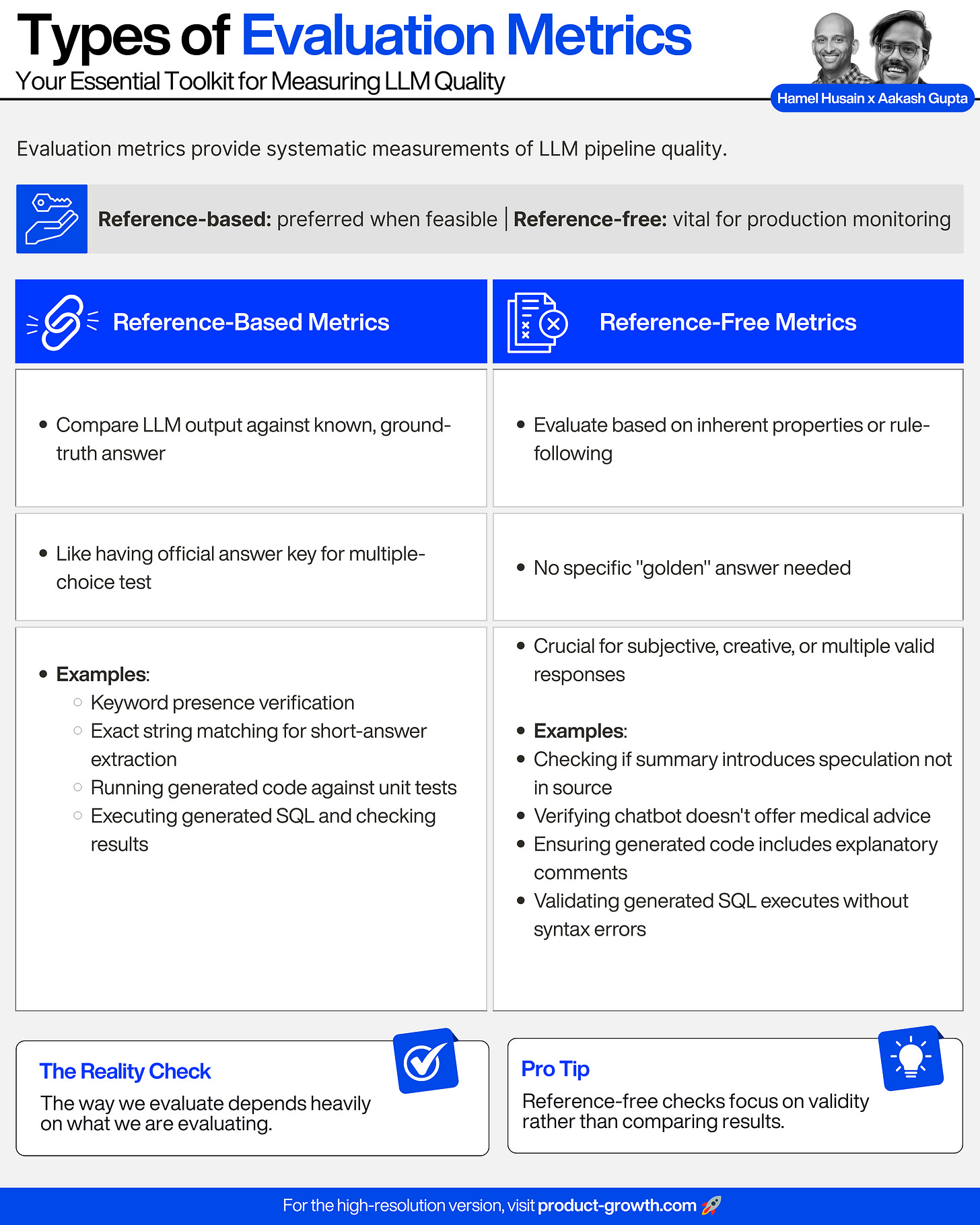 Alternatively, reference-free metrics evaluate an LLM’s output based on its inherent properties or whether it follows certain rules, operating without a specific “golden” answer.