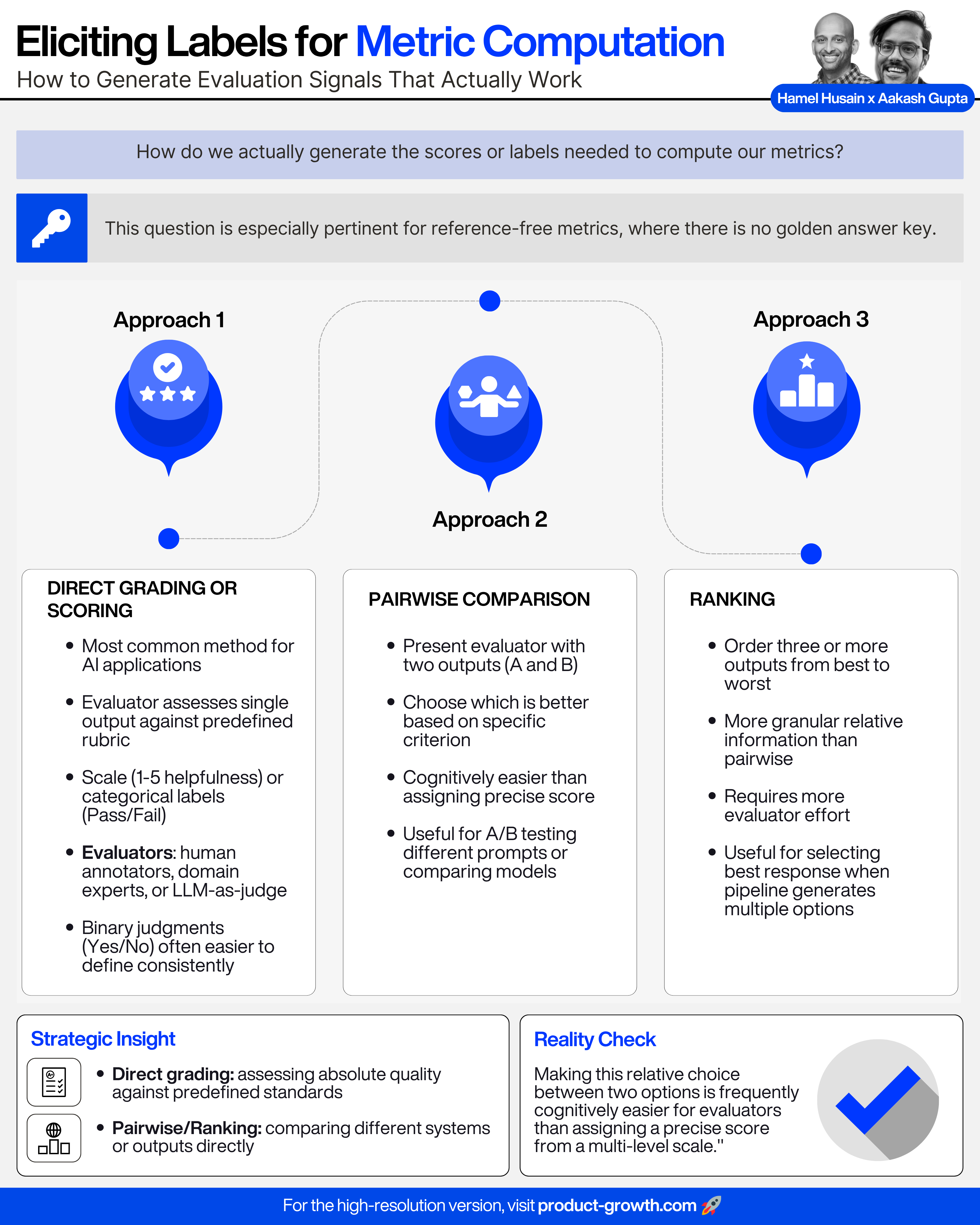 Since application-specific evaluations often involve criteria beyond simple right/wrong answers, we need methods to systematically capture these judgments. How do we actually generate these evaluation signals?