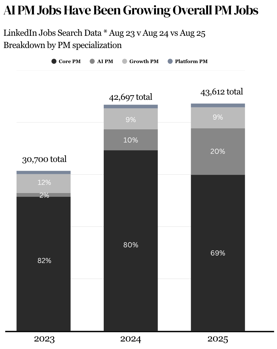 AI PM roles now represent 20% of all PM openings at top tech companies, up from 10% in 2024, and <2% in 2023.
