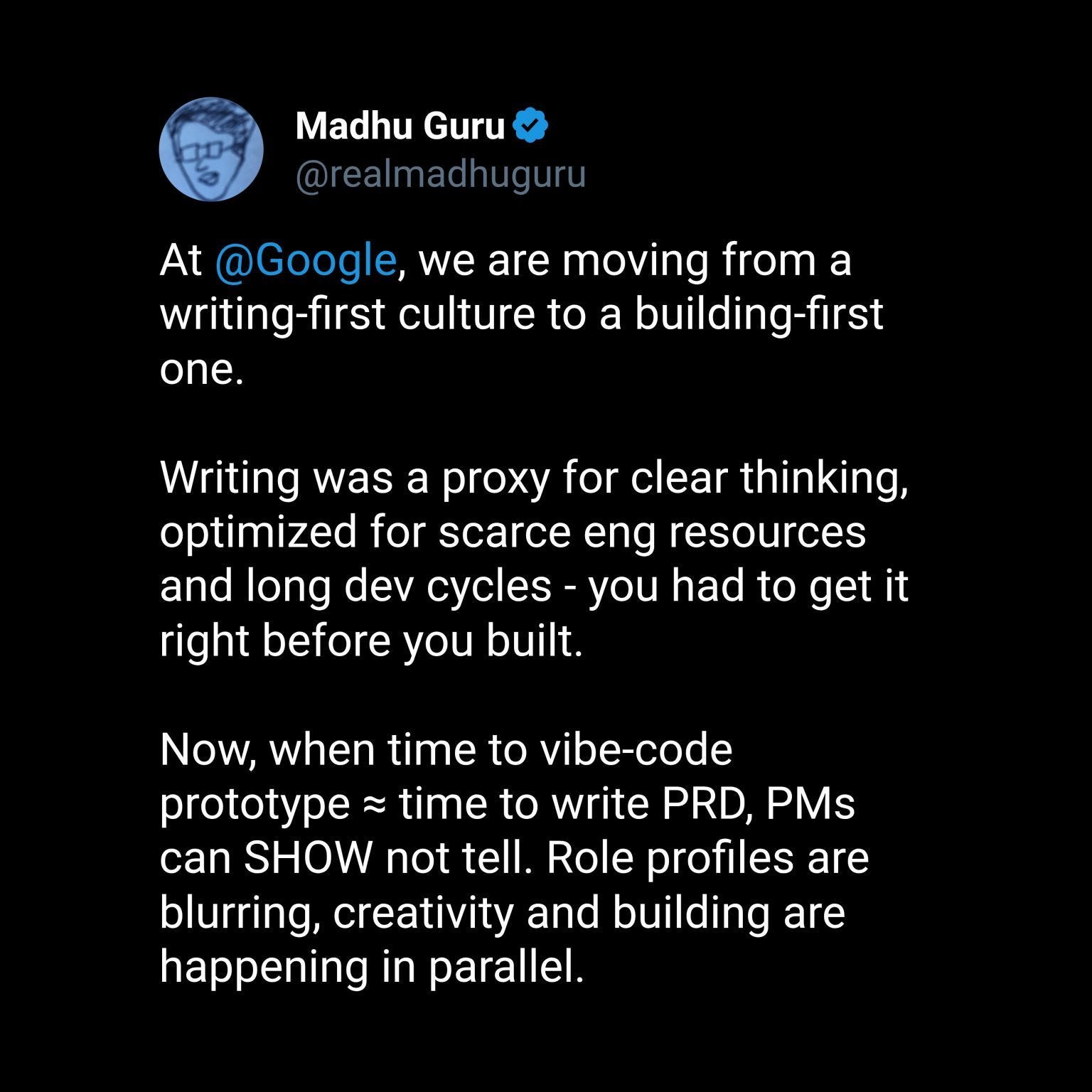 The Head of Product for Google Gemini posted that Google is moving from PRDs to prototypes:
