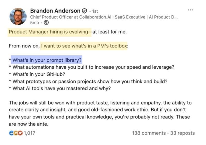 My friend Brandon Anderson is a chief product officer. When interviewing PMs, he asks: “Can you show me your prompt library?”