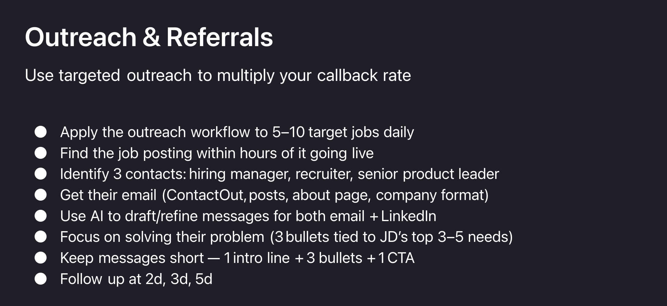 Cold apps: 1% callback. Outreach + app: 10-15% callback.