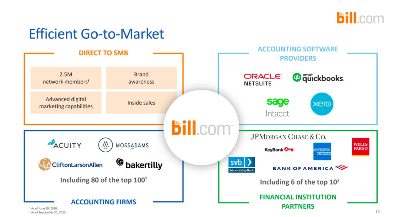 René had the genius idea to partner with small and medium-sized business accountants. These were typical small businesses themselves, with a dozen or hundred clients. But they would prove enough. In fact, this single channel would be the most important to drive Bill.com’s early success.