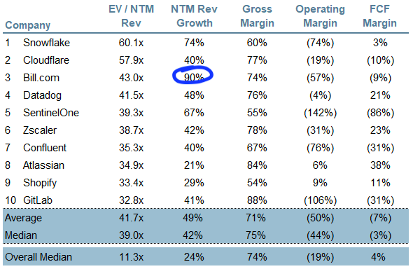 Now, as I touched on in the intro, Bill.com is the fastest growing SaaS company in the world. Its 90% next twelve month revenue growth makes it #1 in a crowded field where the median is growing at 42%.