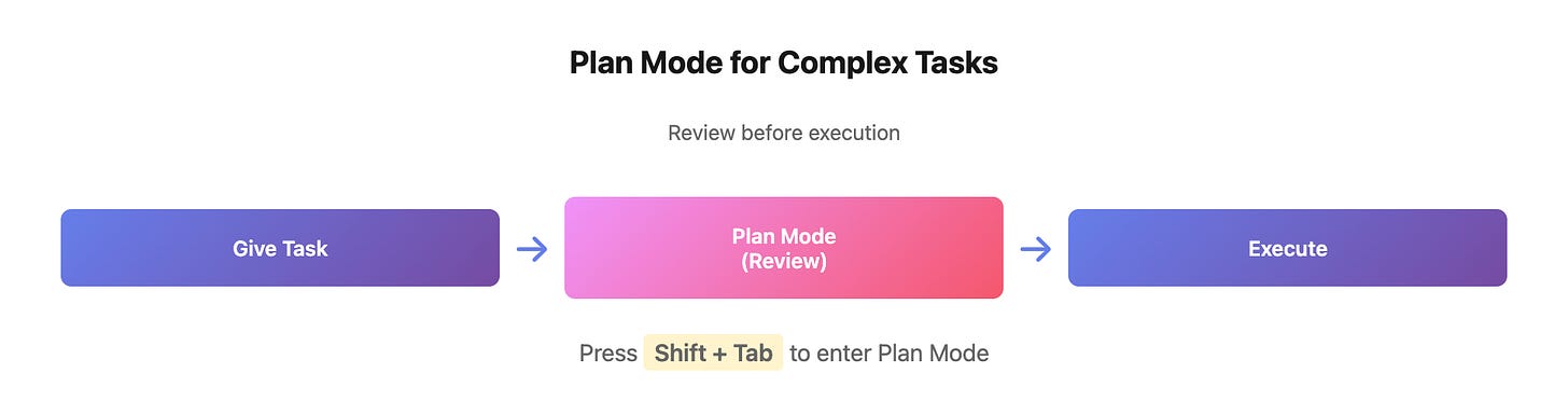 For complex projects, use Plan Mode (Shift + Tab). Claude can’t edit files in this mode - it only researches and plans. You review the plan, make corrections, then let it execute.