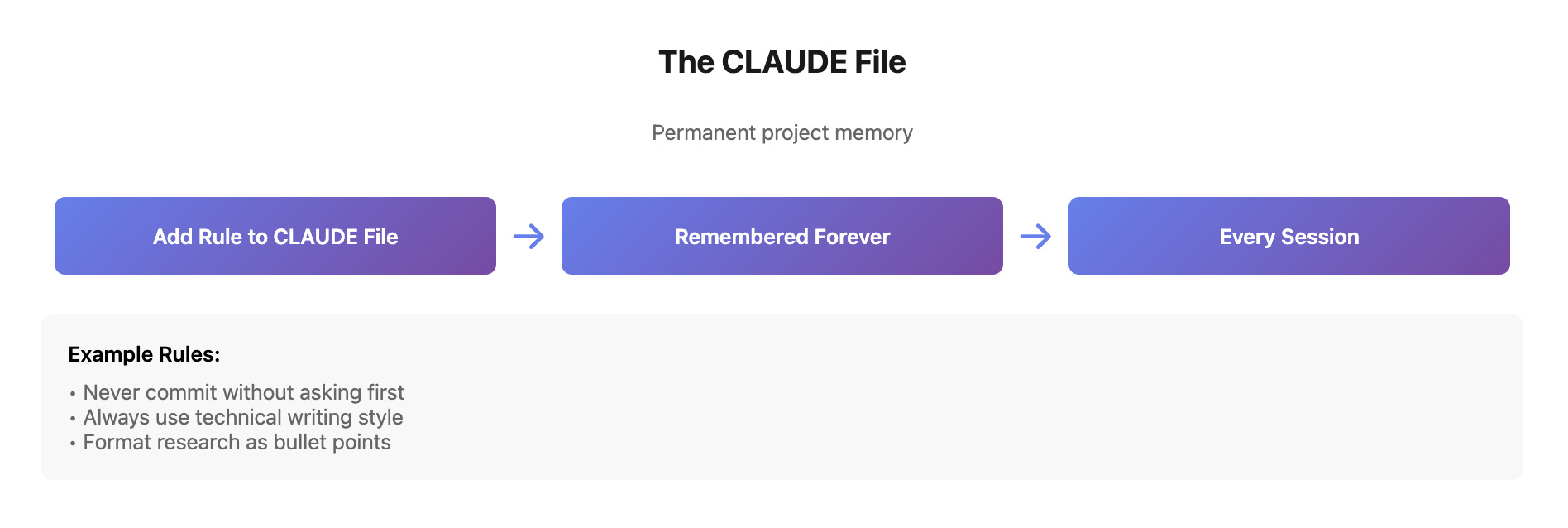 Unlike prompts that get lost in context windows, everything in the CLAUDE file stays in memory permanently.