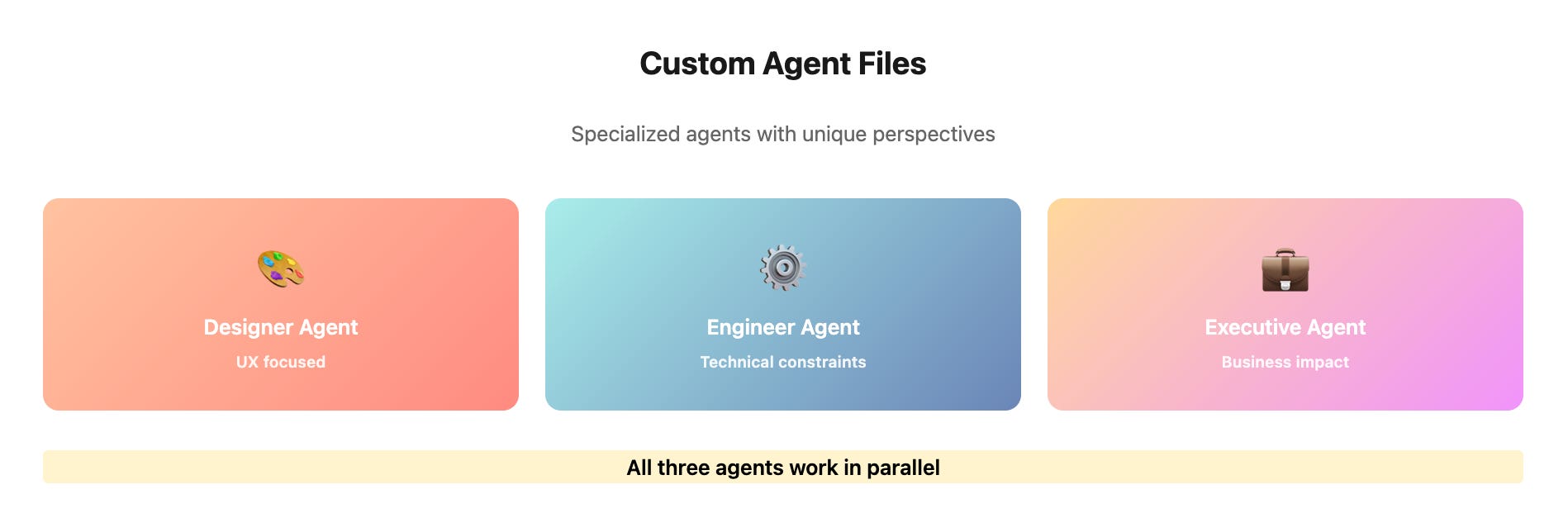 When reviewing a PRD, he says “review from designer, engineer, and executive perspectives” - and three agents work in parallel, each giving specialized feedback.