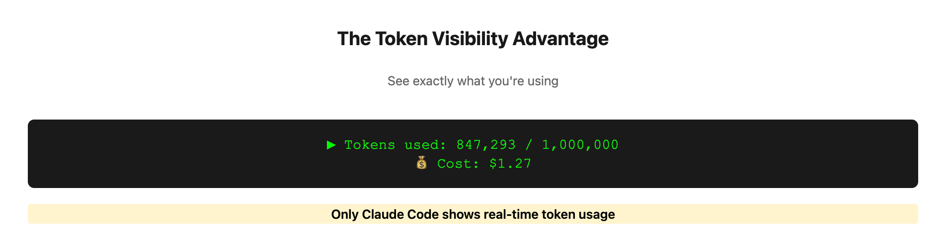 Claude Code shows you exactly how many tokens each task uses. No other interface does this.