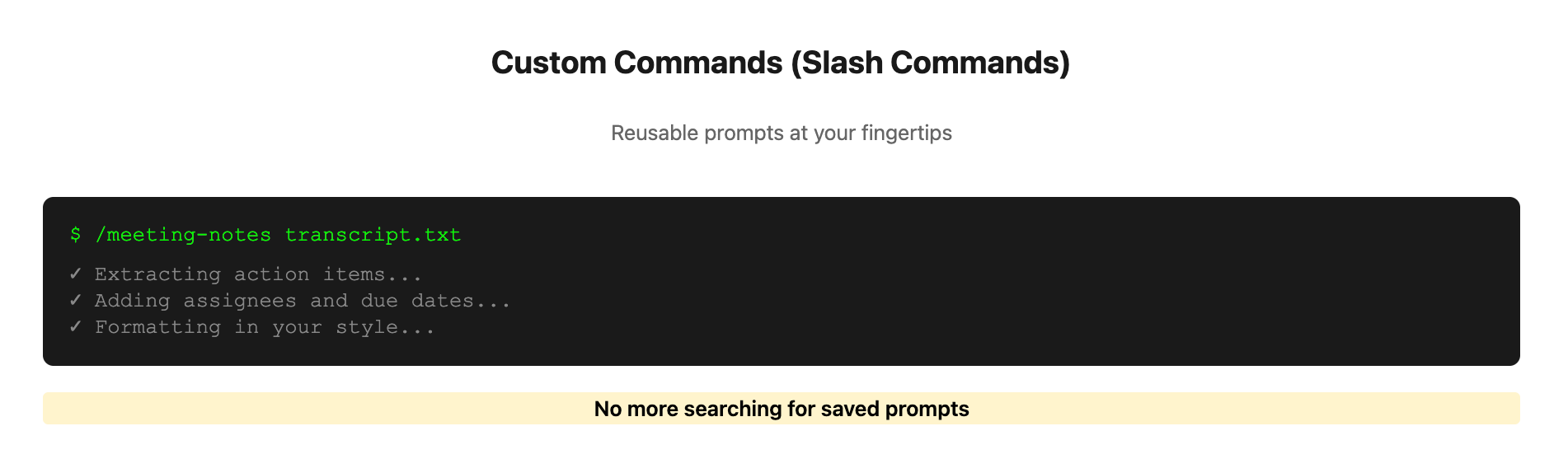 You can save any prompt as a reusable command. Instead of finding that great prompt you bookmarked on Twitter six months ago, just type /meeting-notes