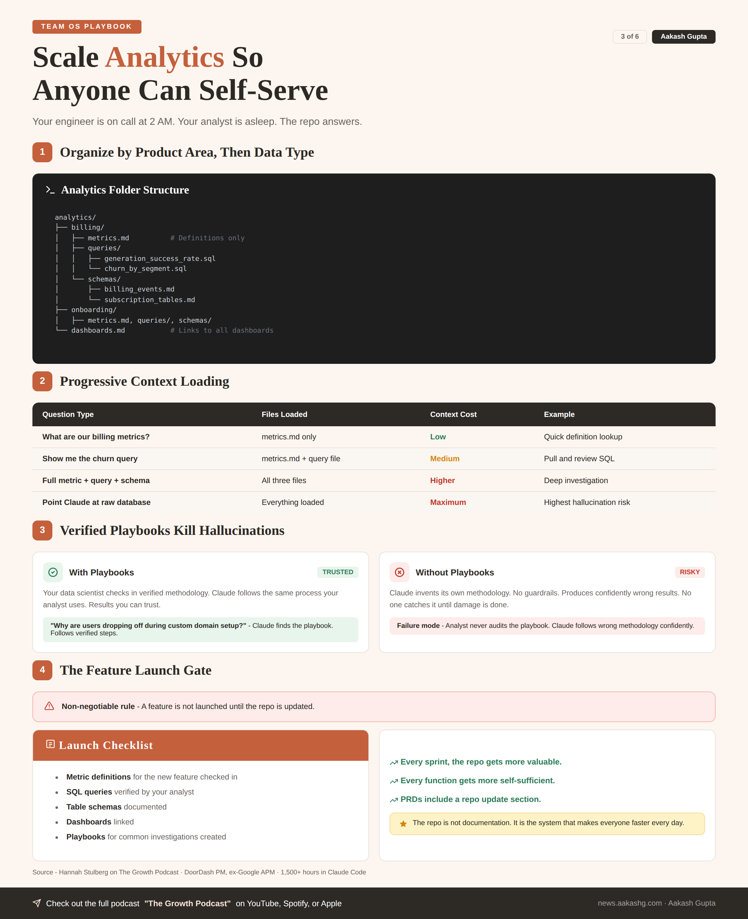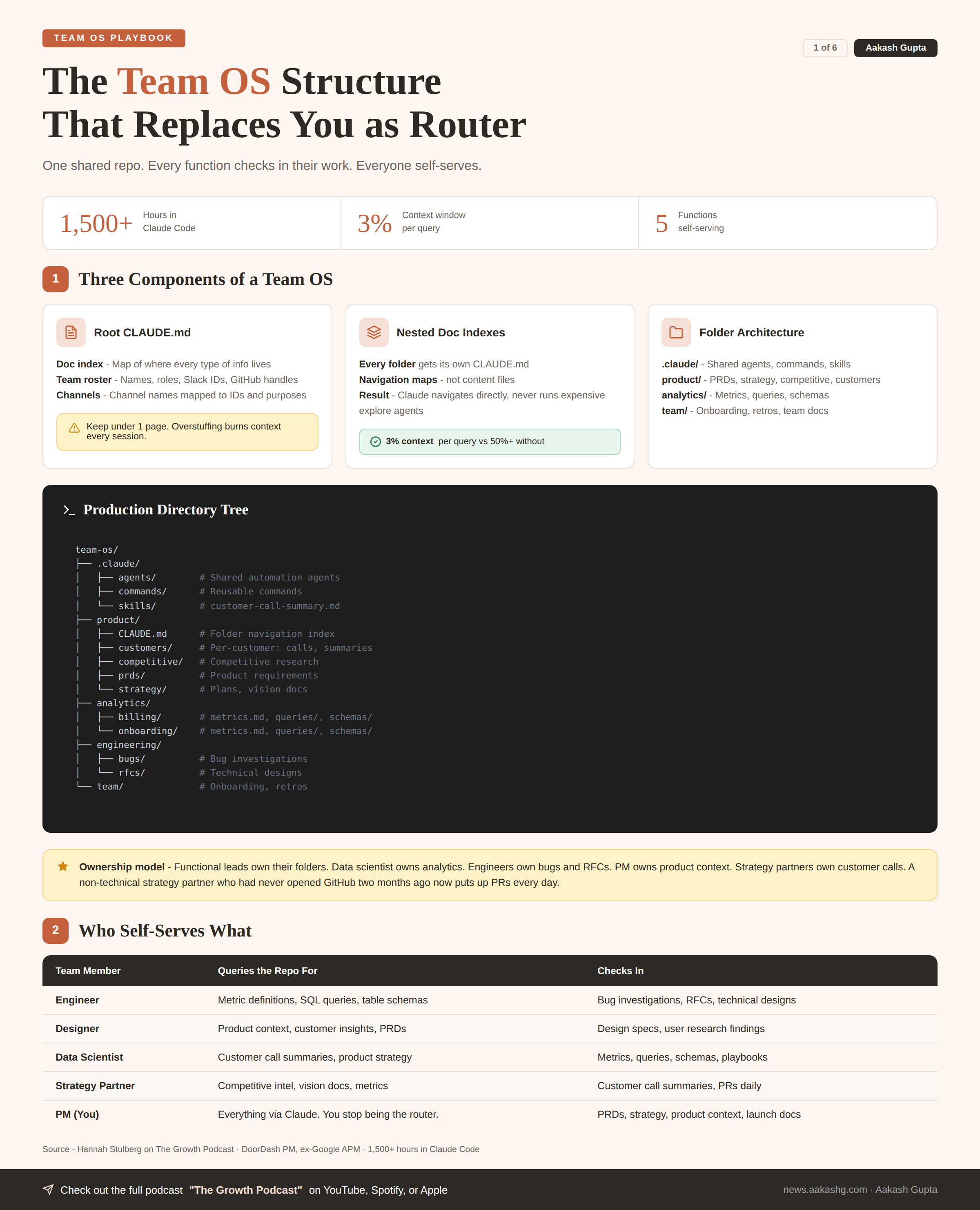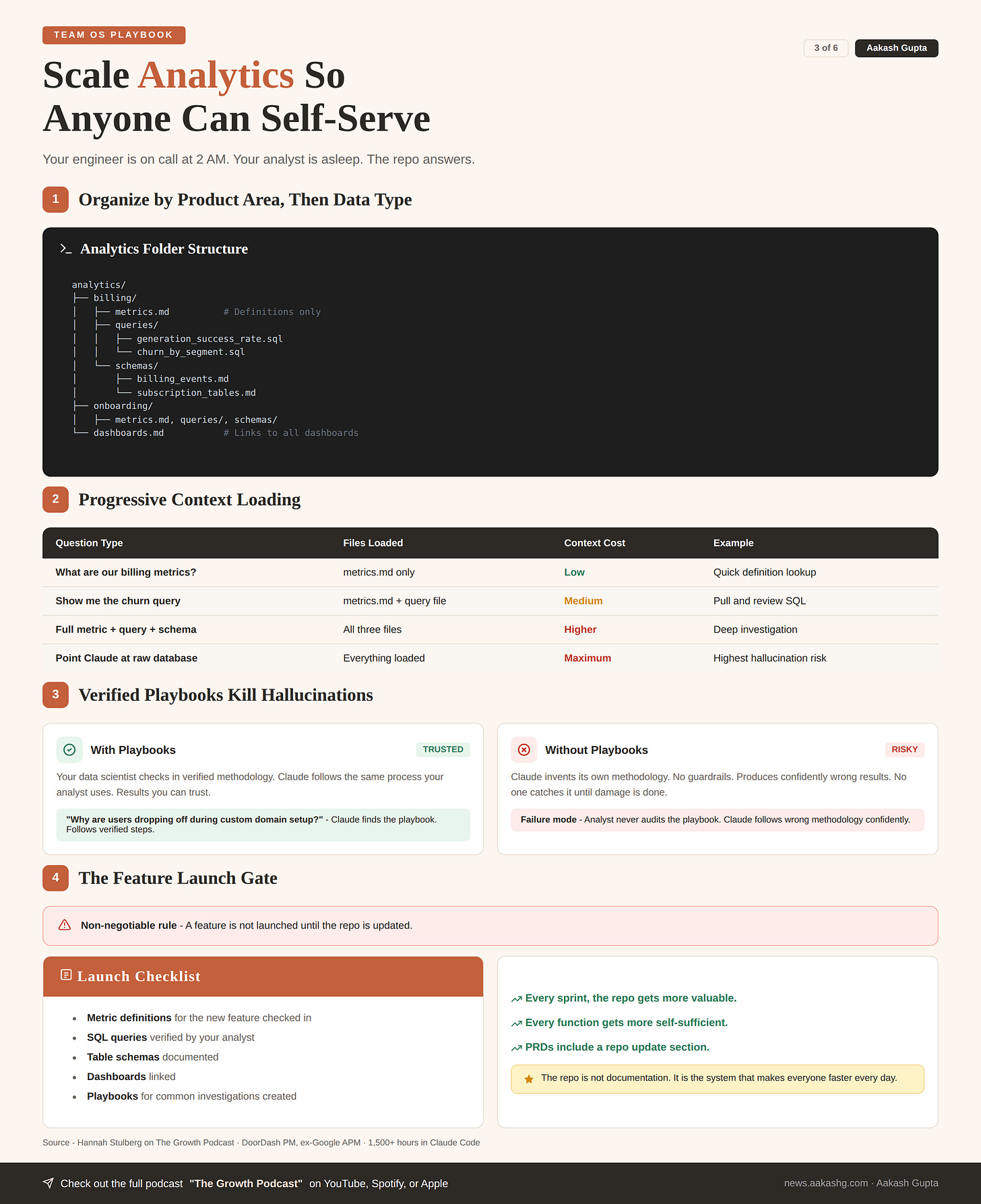 └── retros/The ownership model matters too. On the team in the episode, functional leads own their folders but the whole team agrees on structure. The data scientist owns analytics. Engineers own bugs and RFCs. The PM owns product context. Strategy partners own customer calls.