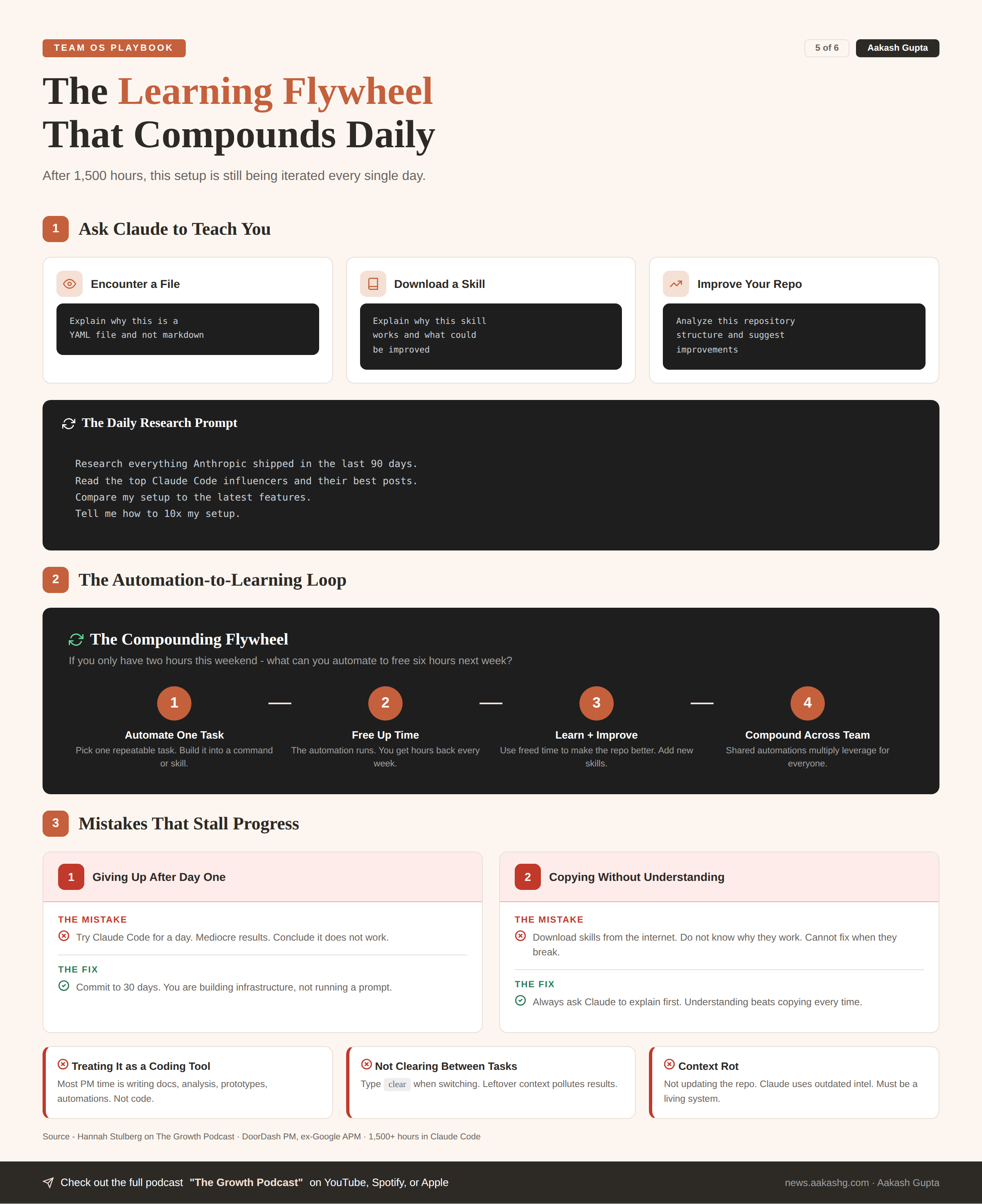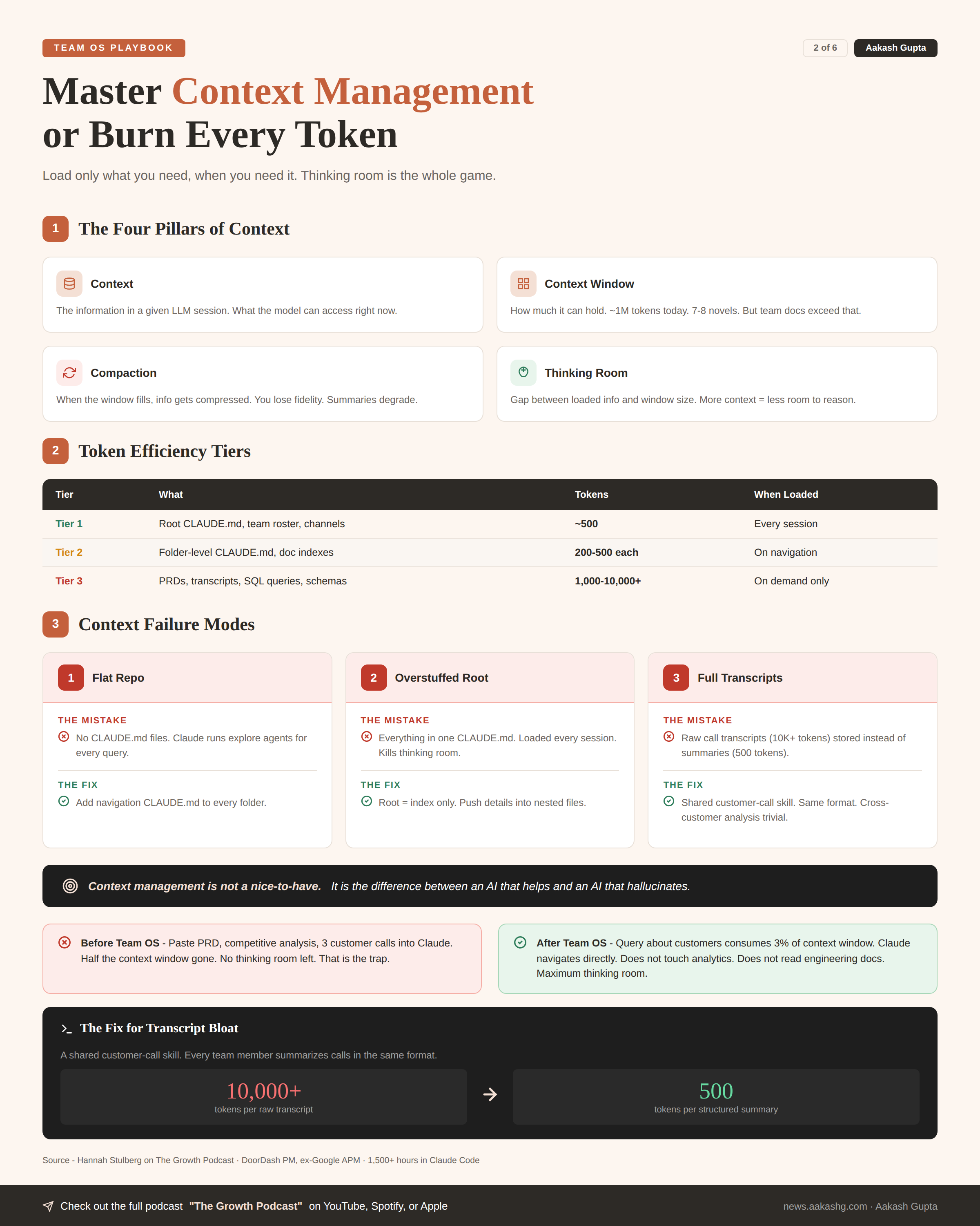 clearwhen switching. Leftover context pollutes results.Context rot. Not updating the repo. Claude uses outdated competitive intel. Outdated metrics. The repo must be a living system that every team member updates as part of their workflow.