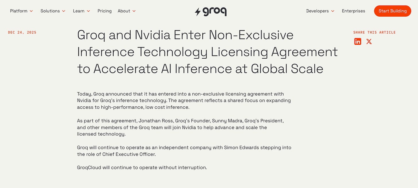Nvidia and Groq announced something weird on Christmas eve. A “non-exclusive licensing agreement” + Nvidia hiring Groq’s founder, president, and key engineers.