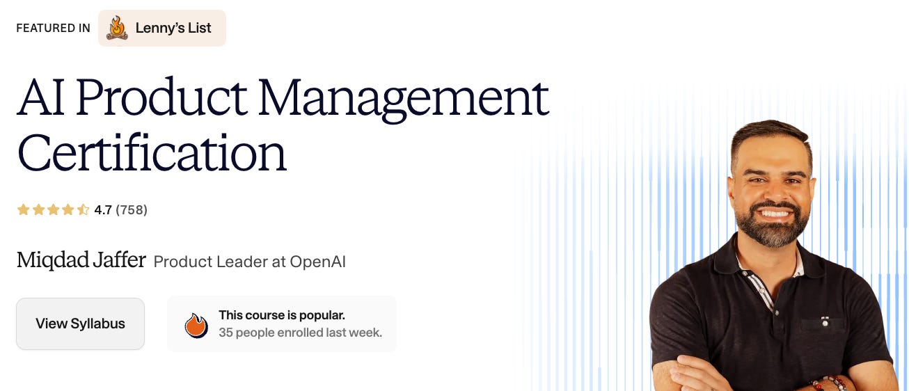 In 2024, when AI PM was becoming a thing, I dropped into this course by Miqdad Jaffer. Since then, the course has transformed and iterated to the #1 AI PM Certificate, with over 758 reviews.
