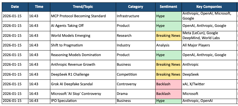 Scan for topics related to AI, machine learning, LLMs, or specific companies (OpenAI, Anthropic, Google DeepMind, Meta AI).