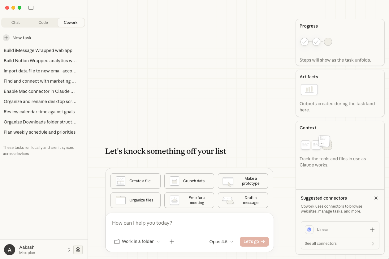 It’s a Mac app that runs locally. Gives Claude access to your filesystem, your browser, external services through connectors. You describe a task, walk away, come back when it’s done.