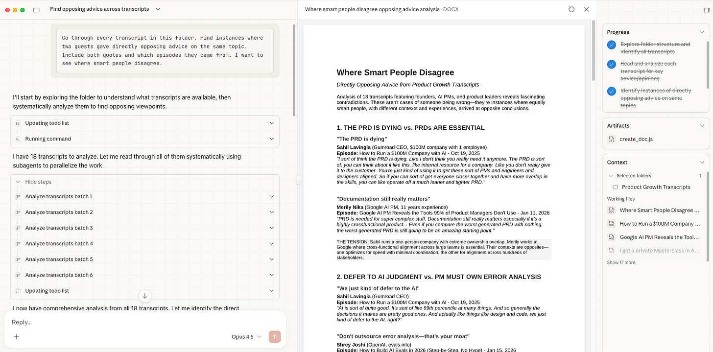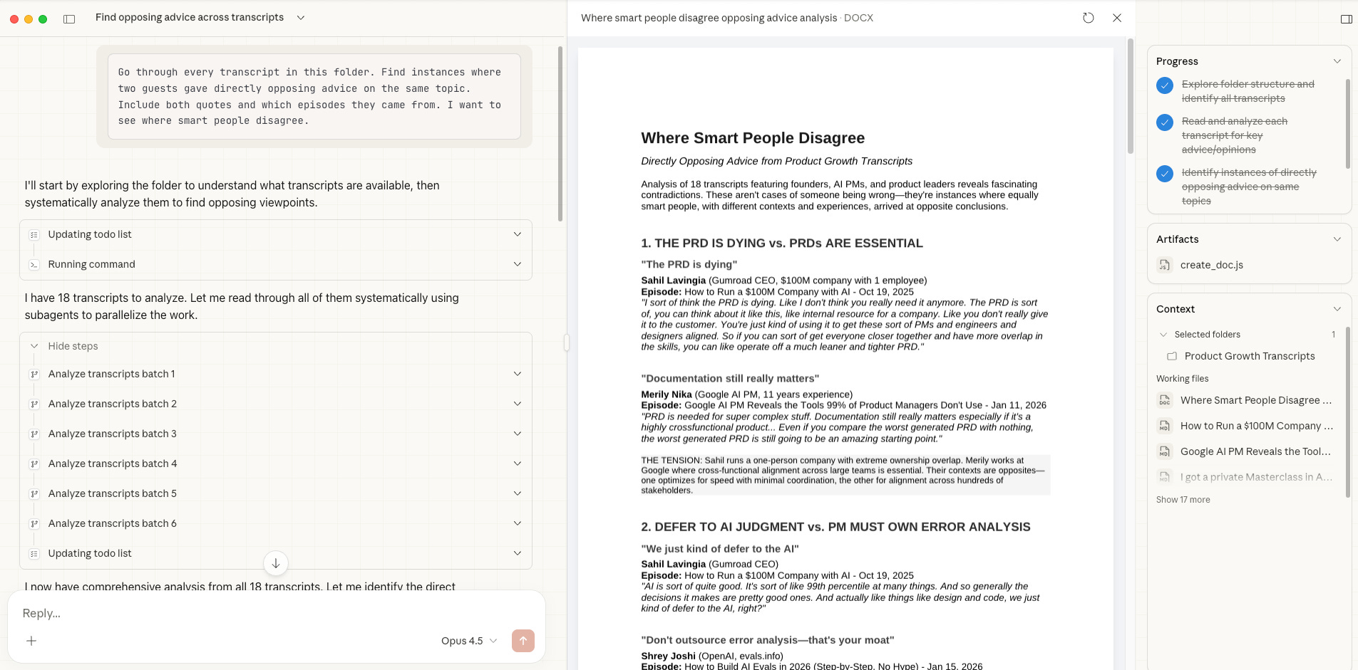 Go through every transcript in this folder. Find instances where two guests gave directly opposing advice on the same topic. Include both quotes and which episodes they came from. I want to see where smart people disagree.It spun up multiple agents in parallel, each one working through a batch of transcripts. Fifteen minutes later I had a list of genuine debates I’d hosted without realizing it.