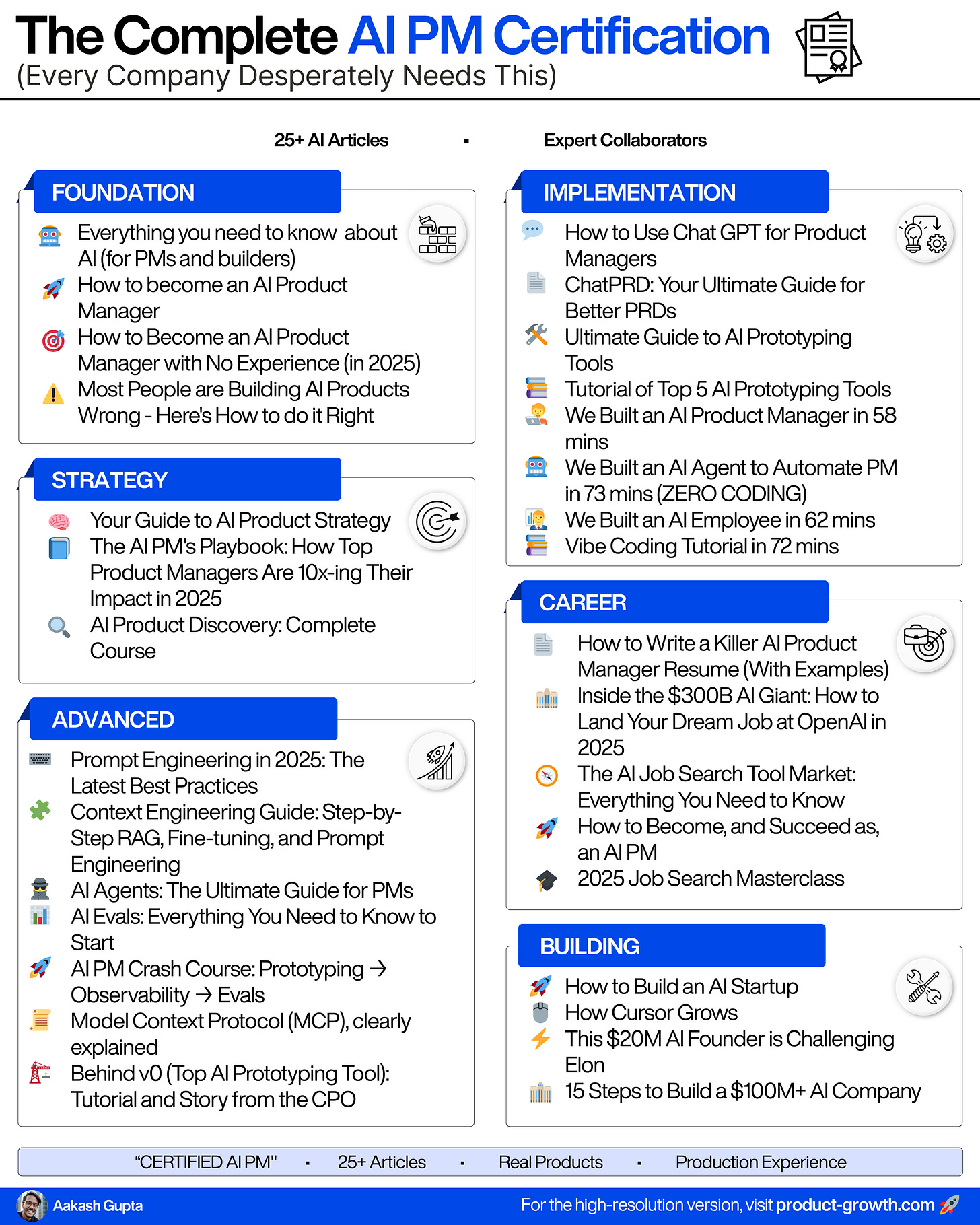 For PMs who want to go deep on the technical side. Learn advanced concepts like prompt engineering, RAG systems, AI agents, and evaluation frameworks that separate good AI PMs from great ones.