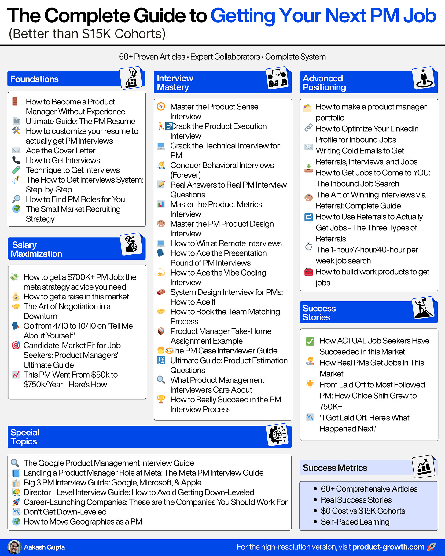 The complete system for getting PM interviews and converting them to offers. From resume optimization to salary negotiation, everything you need for career success.