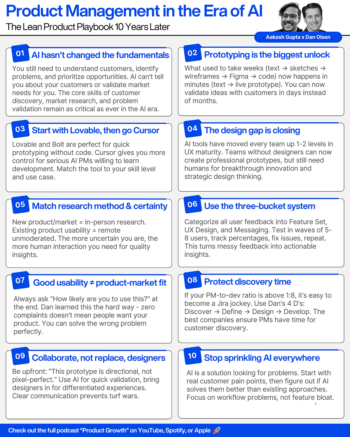 The timeless parts: You still need to understand customers, identify problems, and prioritize opportunities. AI can't tell you about your customers or validate market needs.