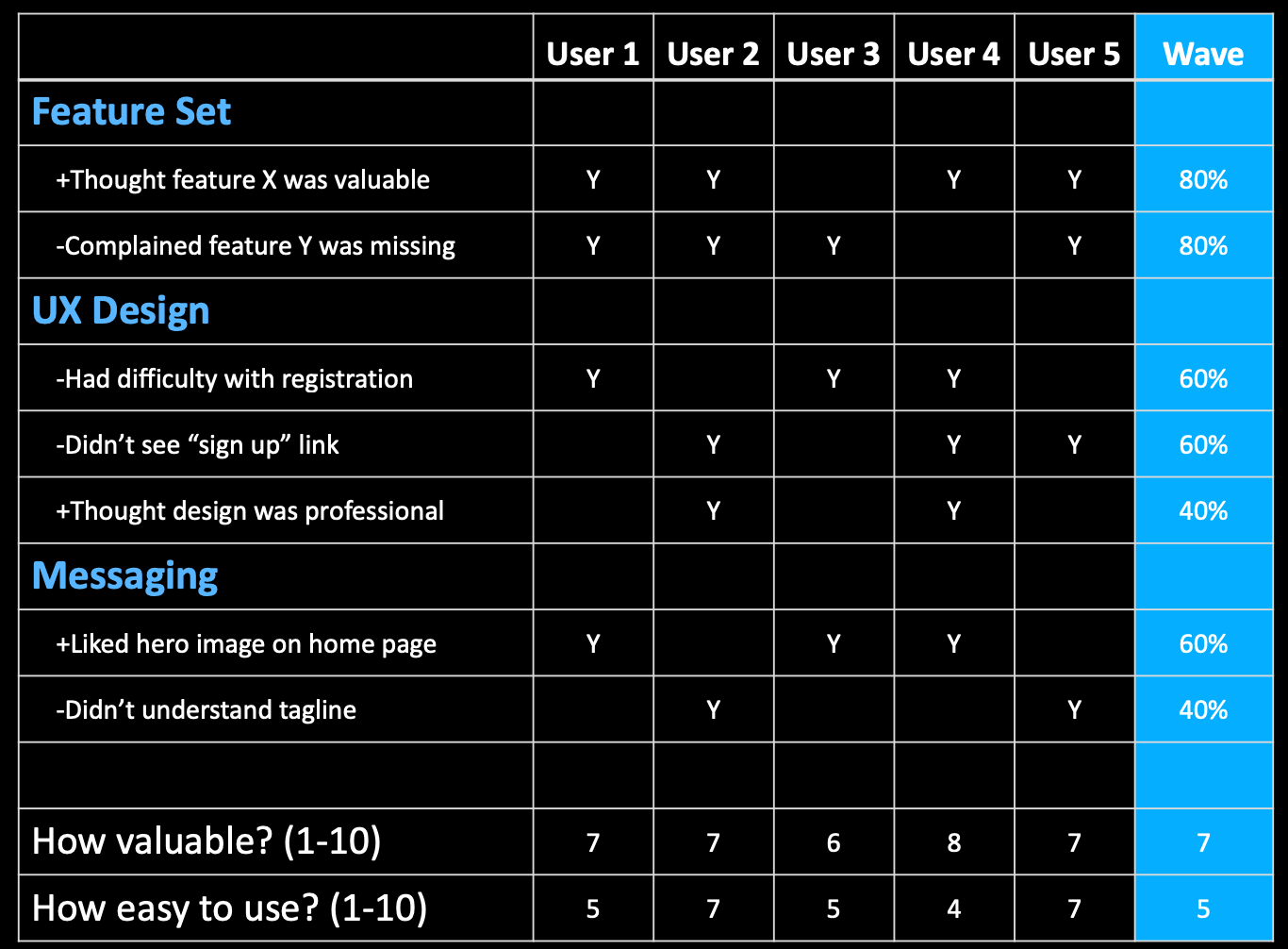 His secret template: Create a simple table tracking each issue across users, then calculate percentages to prioritize fixes.