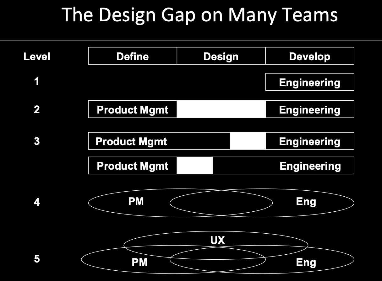 Dan shows his UX maturity framework - from "developers only" teams to the full PM/Design/Engineering triad. AI tools have essentially moved every team up 1-2 levels.