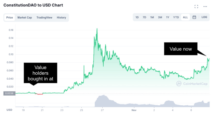 As of writing, the token has a market cap of $610M. If you had put $2,500 dollars into the constitution DAO - the average amount - and held your $PEOPLE tokens, they would now be worth about $30,000.