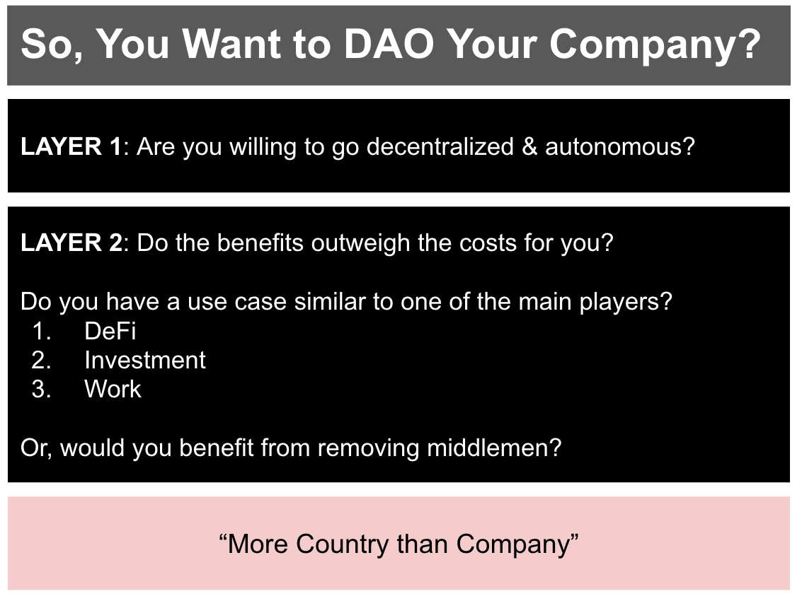 That is the first, and most important, layer for implementing a DAO at your company to ask yourself. Do you want to allow decentralized autonomous ownership and consensus control of changes? A DAO virtually requires those.