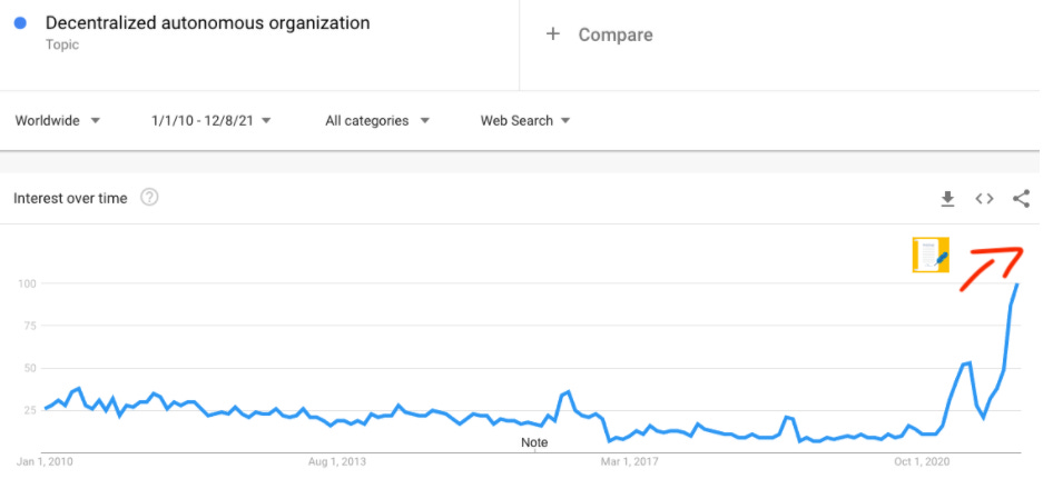 The constitution DAO was a turning point in the history of DAOs. Google search interest has spiked from ~15 in October to 100 now: