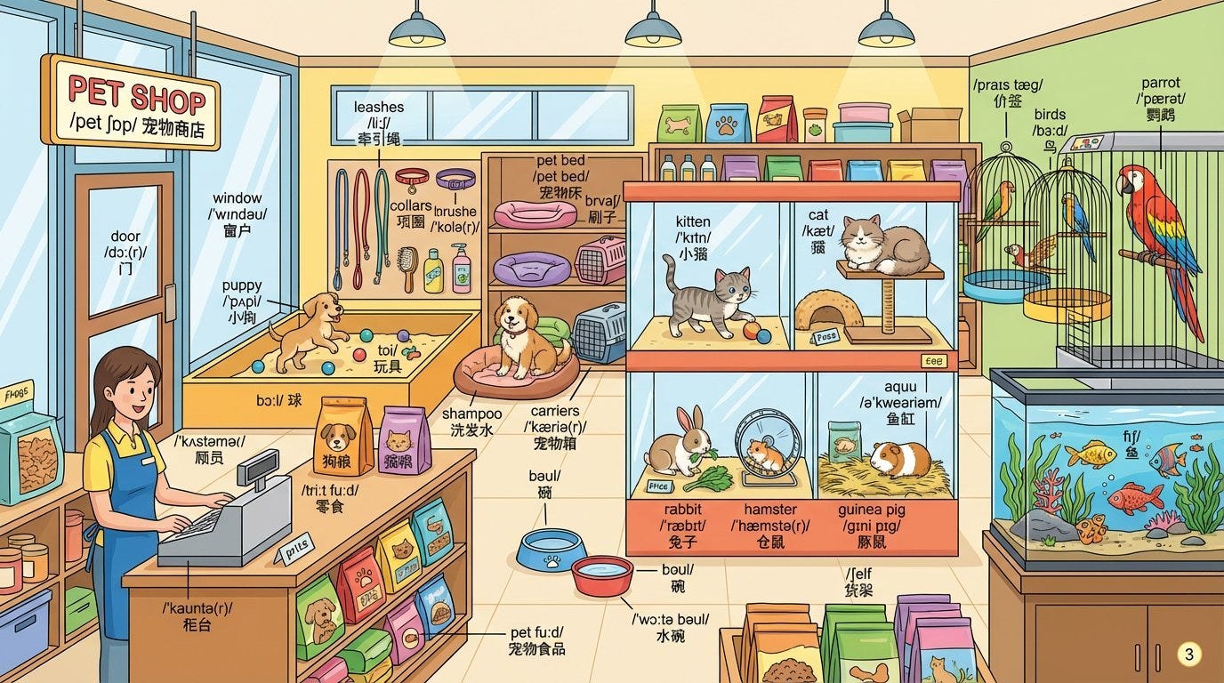 Draw a detailed {{pet shop}} scene and label every object with English words. Label format: First line: English word. Second line: IPA pronunciation. Third line: {Chinese} translation.Credit: Crystal on X