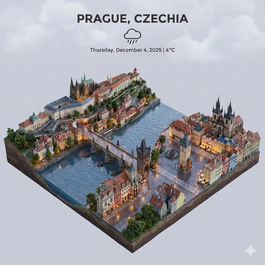 Present a clear, 45° top-down isometric miniature 3D cartoon scene of [CITY], featuring its most iconic landmarks and architectural elements. Use soft, refined textures with realistic PBR materials and gentle, lifelike lighting and shadows. Integrate the current weather conditions directly into the city environment to create an immersive atmospheric mood. Use a clean, minimalistic composition with a soft, solid-colored background. At the top-center, place the title “[CITY]” in large bold text, a prominent weather icon beneath it, then the date (small text) and temperature (medium text). All text must be centered with consistent spacing, and may subtly overlap the tops of the buildings. Square 1080x1080 dimension.2/ Fridge Scanner → Recipe Infographic