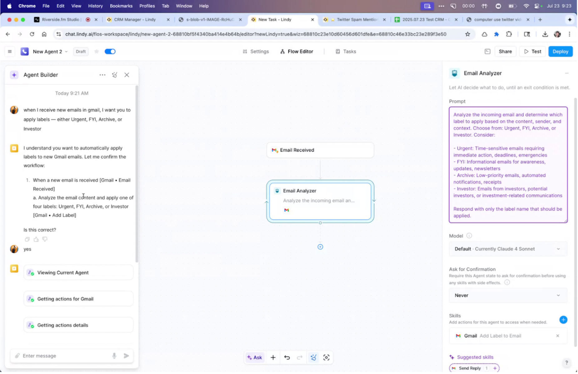 Test & Adjust: Run the agent on recent emails. Check how well it classifies. Tweak logic like: