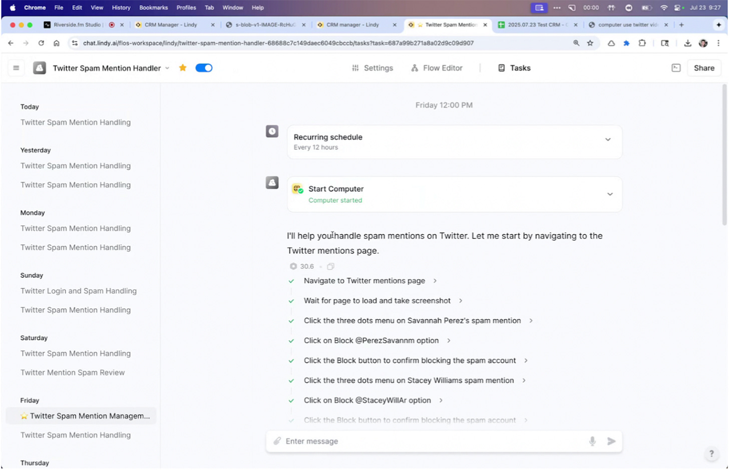 Use Lindy’s “Virtual Cloud Computer” mode — it runs a full browser in the cloud and simulates clicks/typing.Trigger: Every 3 hours (scheduled run). Open Twitter → Scan mentions.