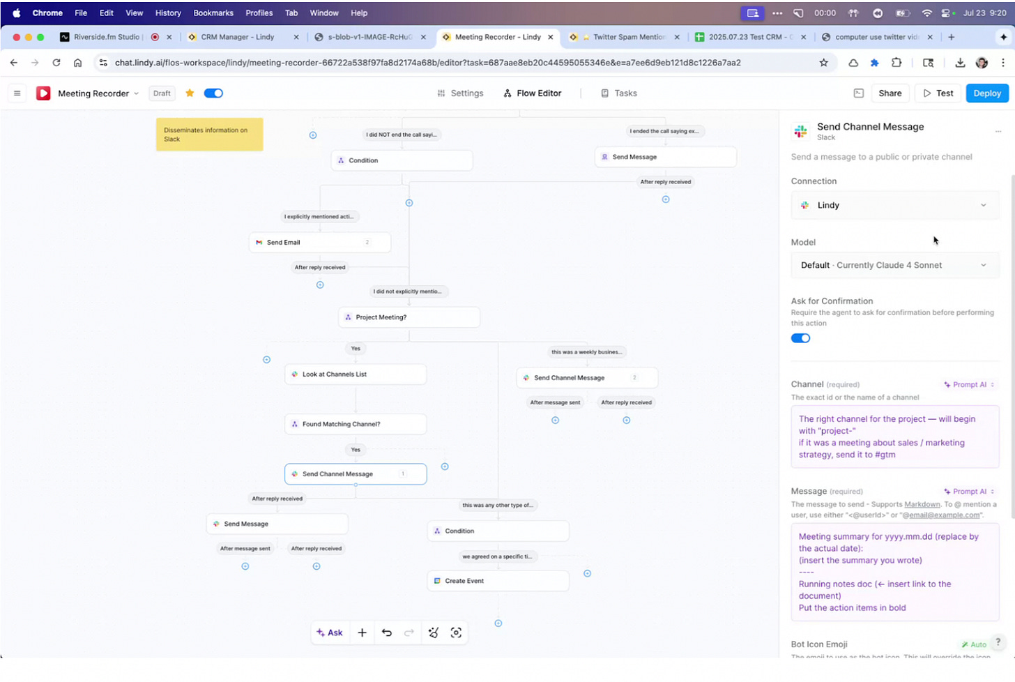 Trigger: “When a meeting begins”.Instructions: