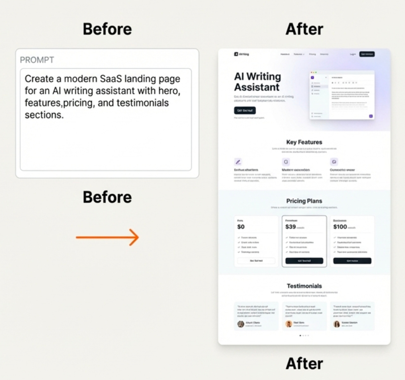 features, pricing, and testimonial sections.Took about 2 minutes. Cost 34 cents. Fully responsive and interactive page.