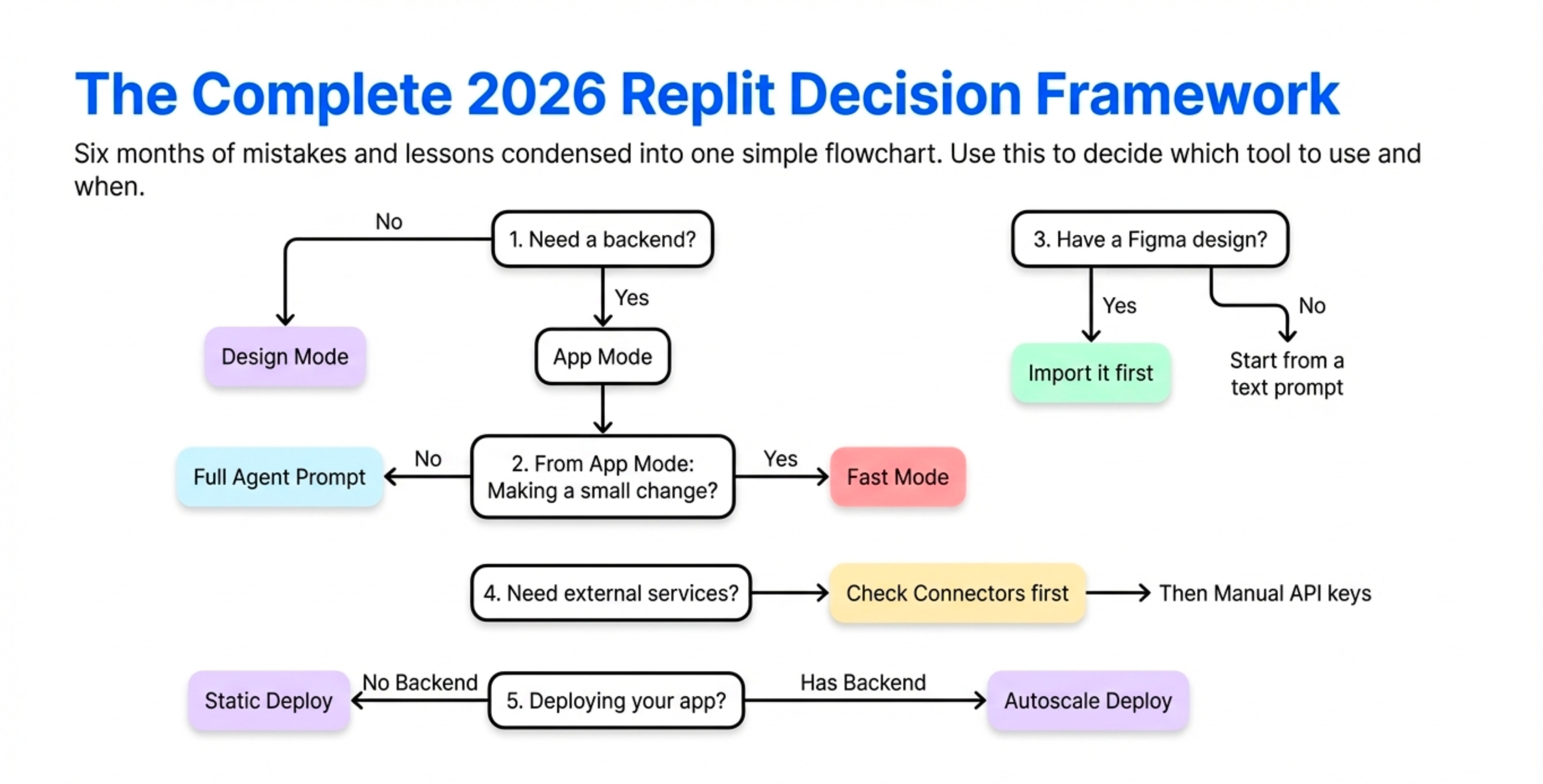 Here’s the mental model. Every time you open Replit, you’re making a series of decisions about which mode to use. Get this right and you’ll save time and money. Get it wrong and you’ll burn through credits doing things the hard way.