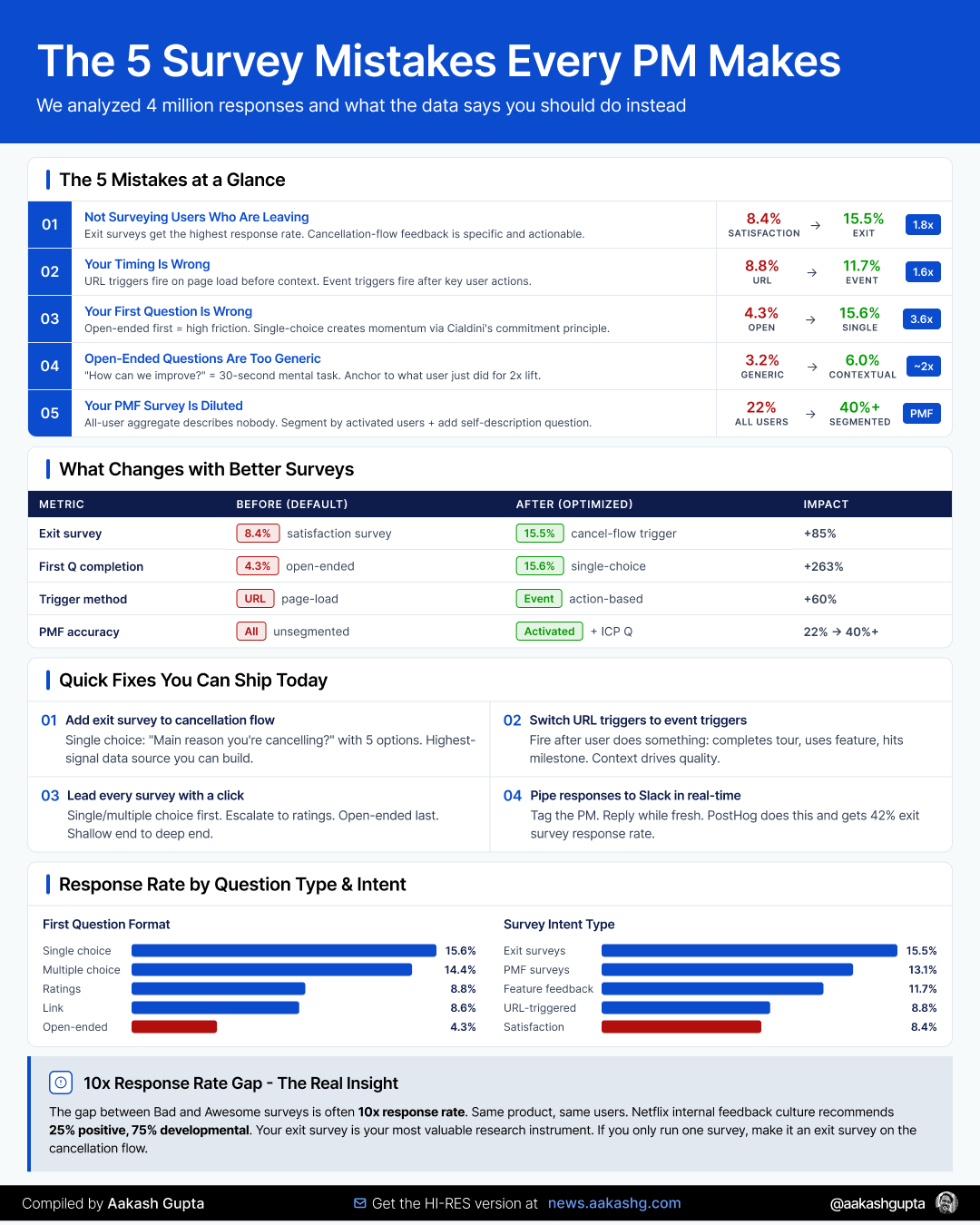 4.2M in-app survey responses analyzed. The 5 mistakes tanking response rates, 6 teardowns (Superhuman, Slack, Amplitude), and the playbook PMs need.