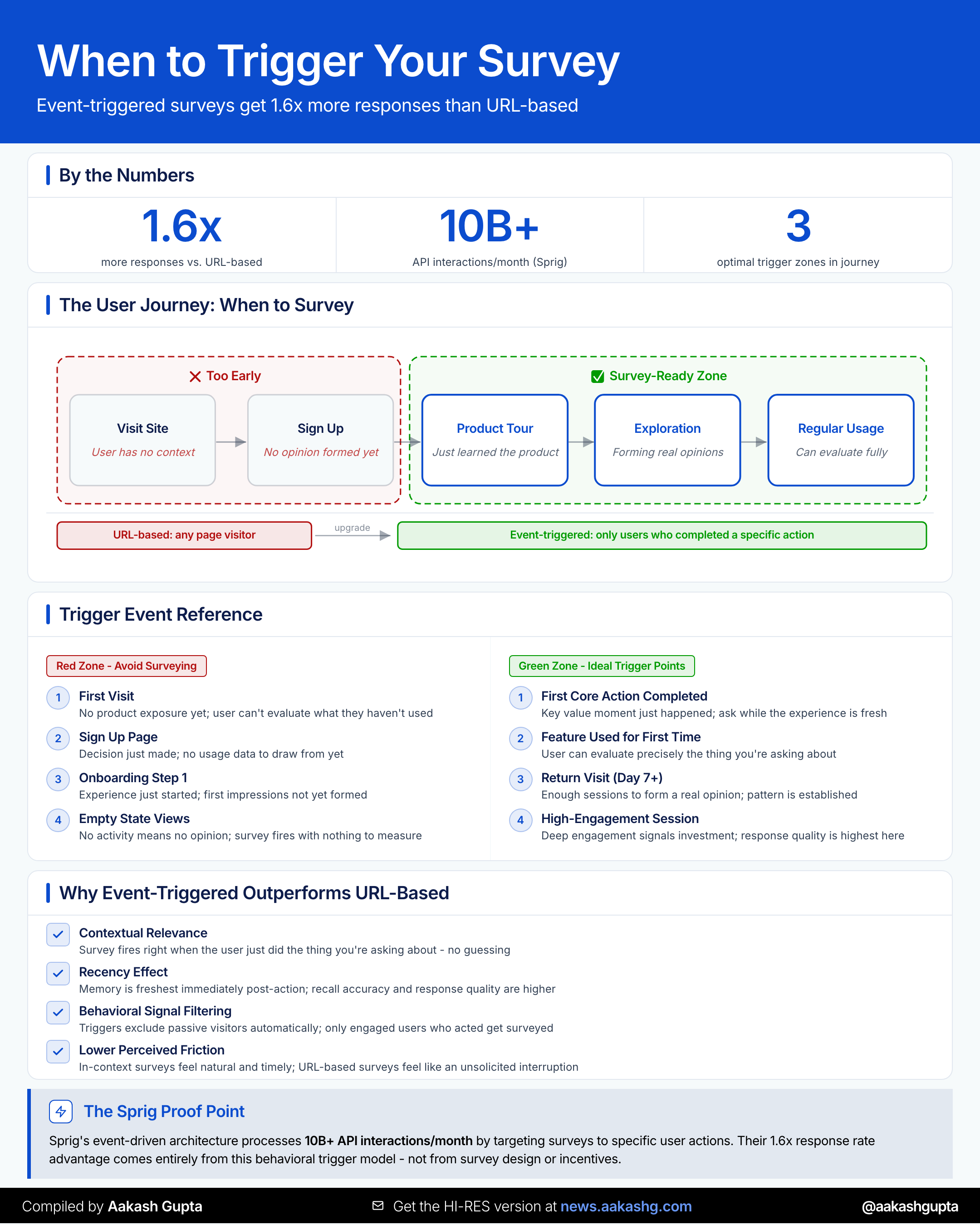 Event-triggered surveys get 1.6x more responses than URL-based targeting (11.7% vs 8.8%). Users who get surveyed on page load are in a background tab, mid-task, or never actually see it.