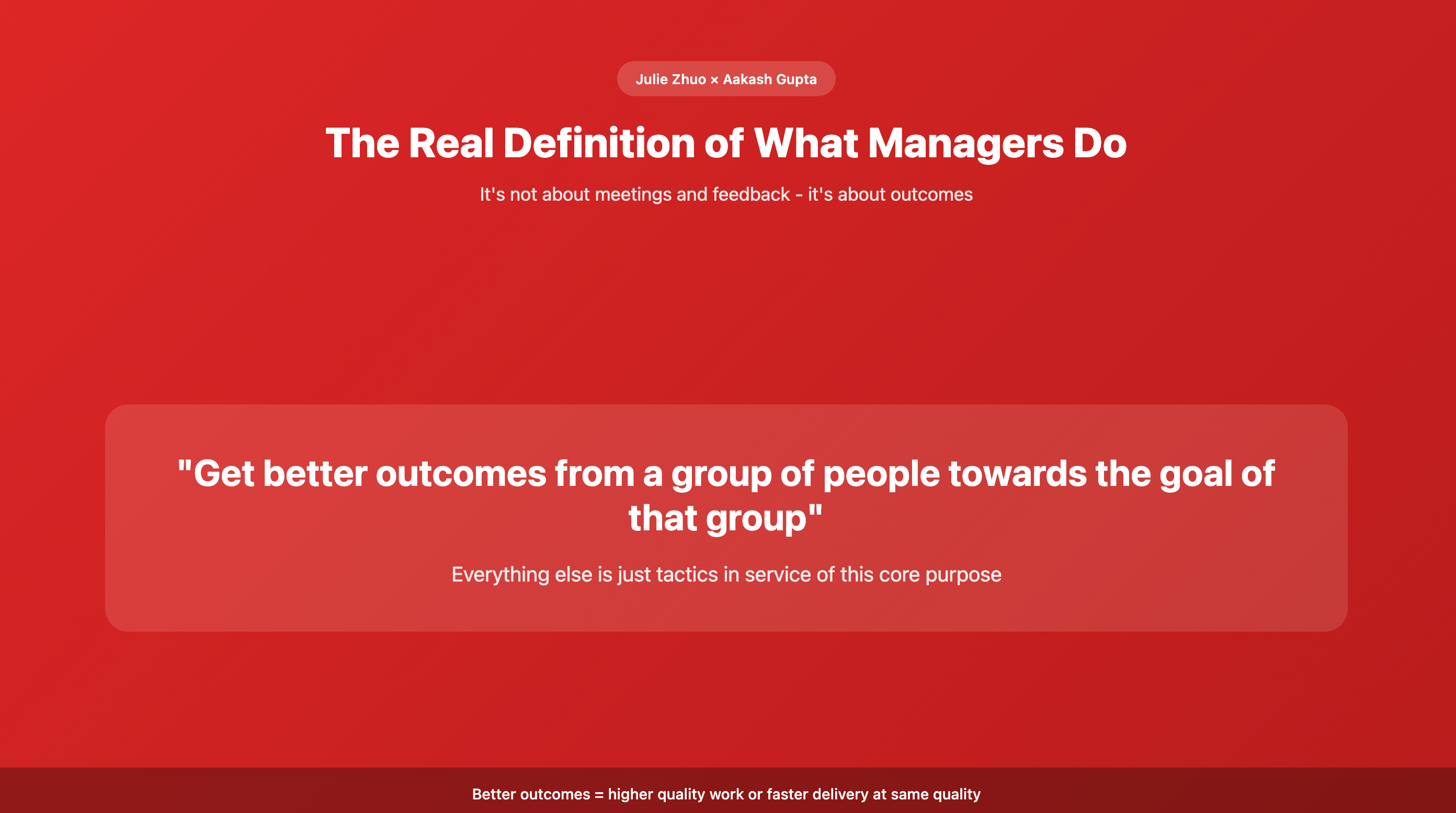 Julie Zhuo spent 13 years at Facebook, starting as an IC designer and rising to VP of Product Design. She wrote the Wall Street Journal bestseller "The Making of a Manager." Today, she's building AI products at Sundial and working with companies like OpenAI.