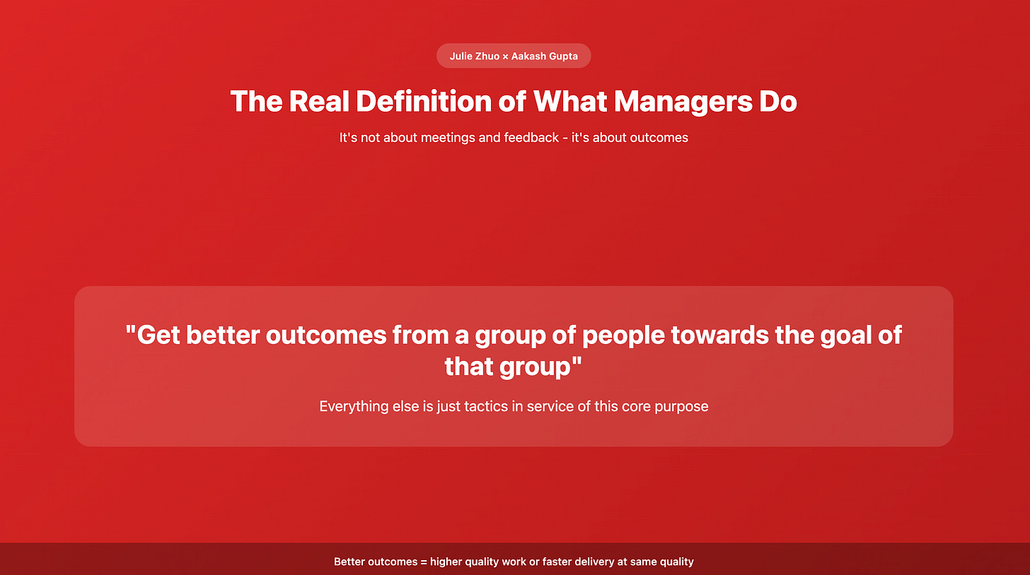 Most people think a manager's job is tactical: have meetings with reports, share feedback, figure out promotions and firing.