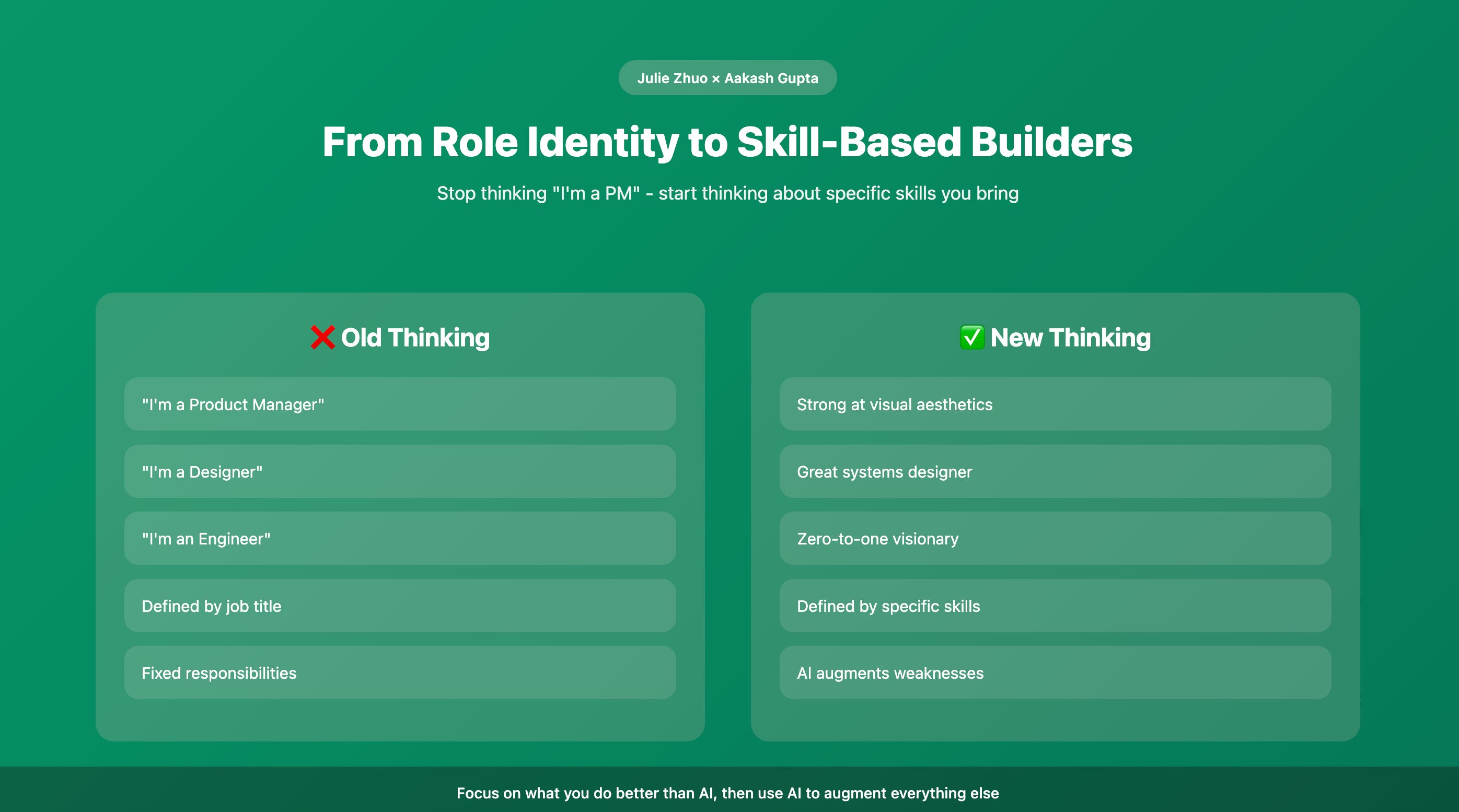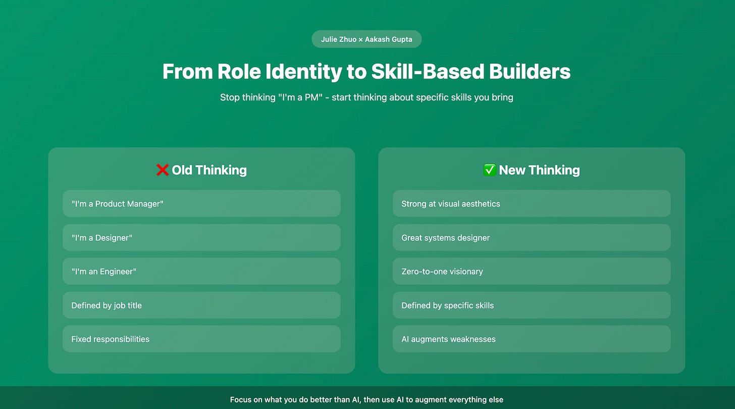 But this moment calls for separation from those lanes. Instead of thinking "I'm a product manager," think about specific skills and experiences: