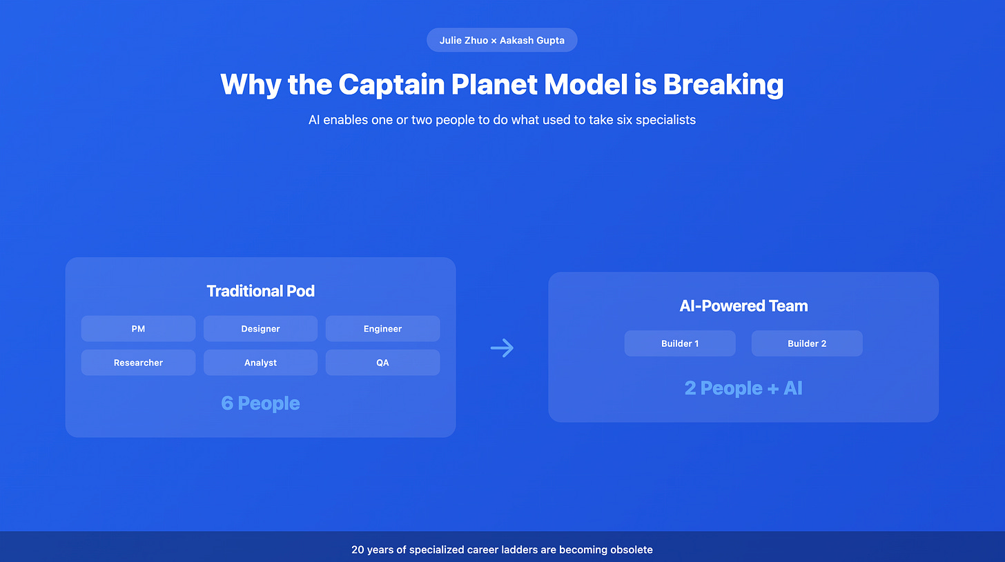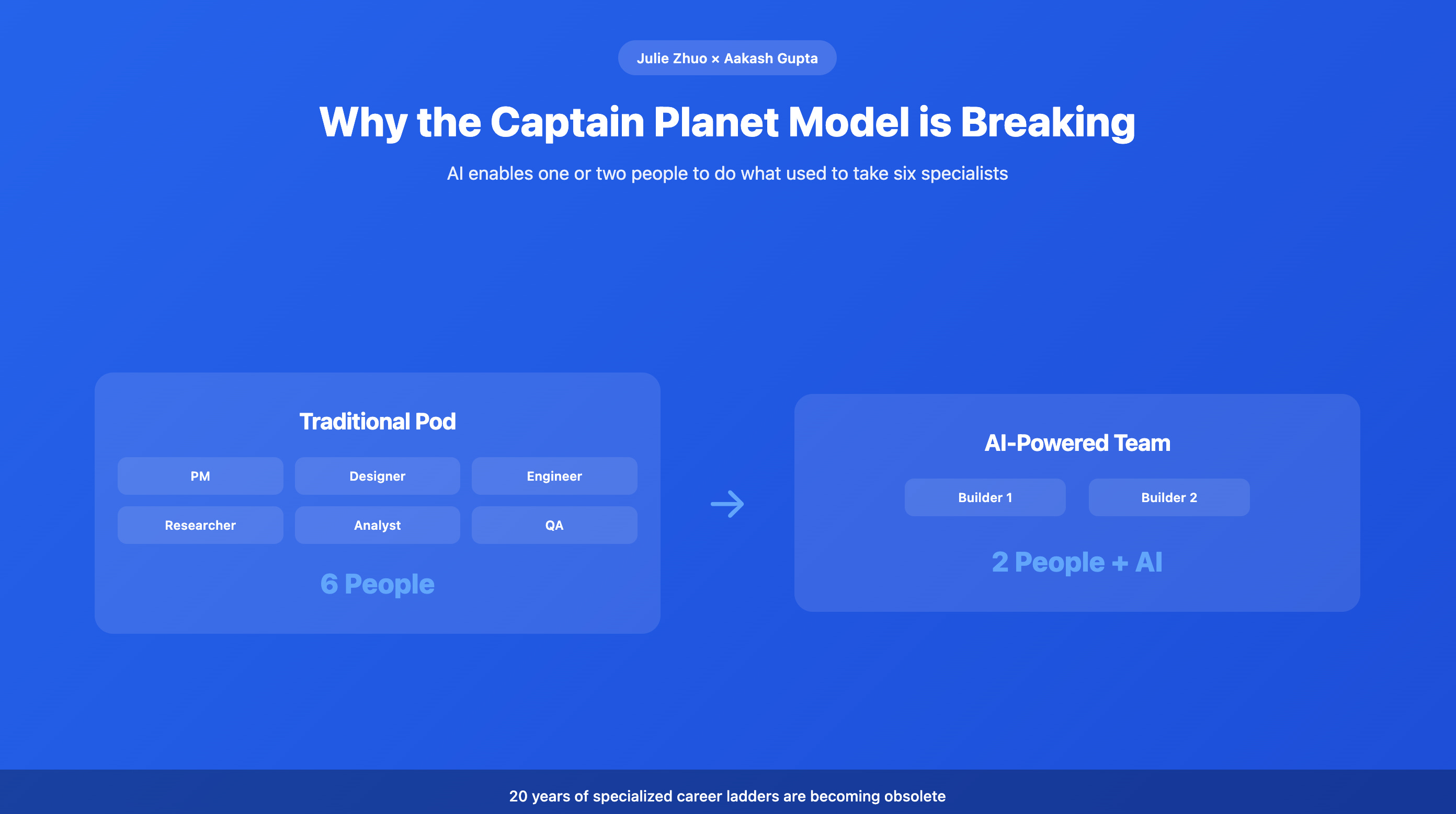 For the past 20 years, we've built our industry around well-defined roles: product designer, engineer, product manager, researcher, data analyst. Julie calls this the "Captain Planet model" - representatives from each discipline come together to form a pod that creates products.