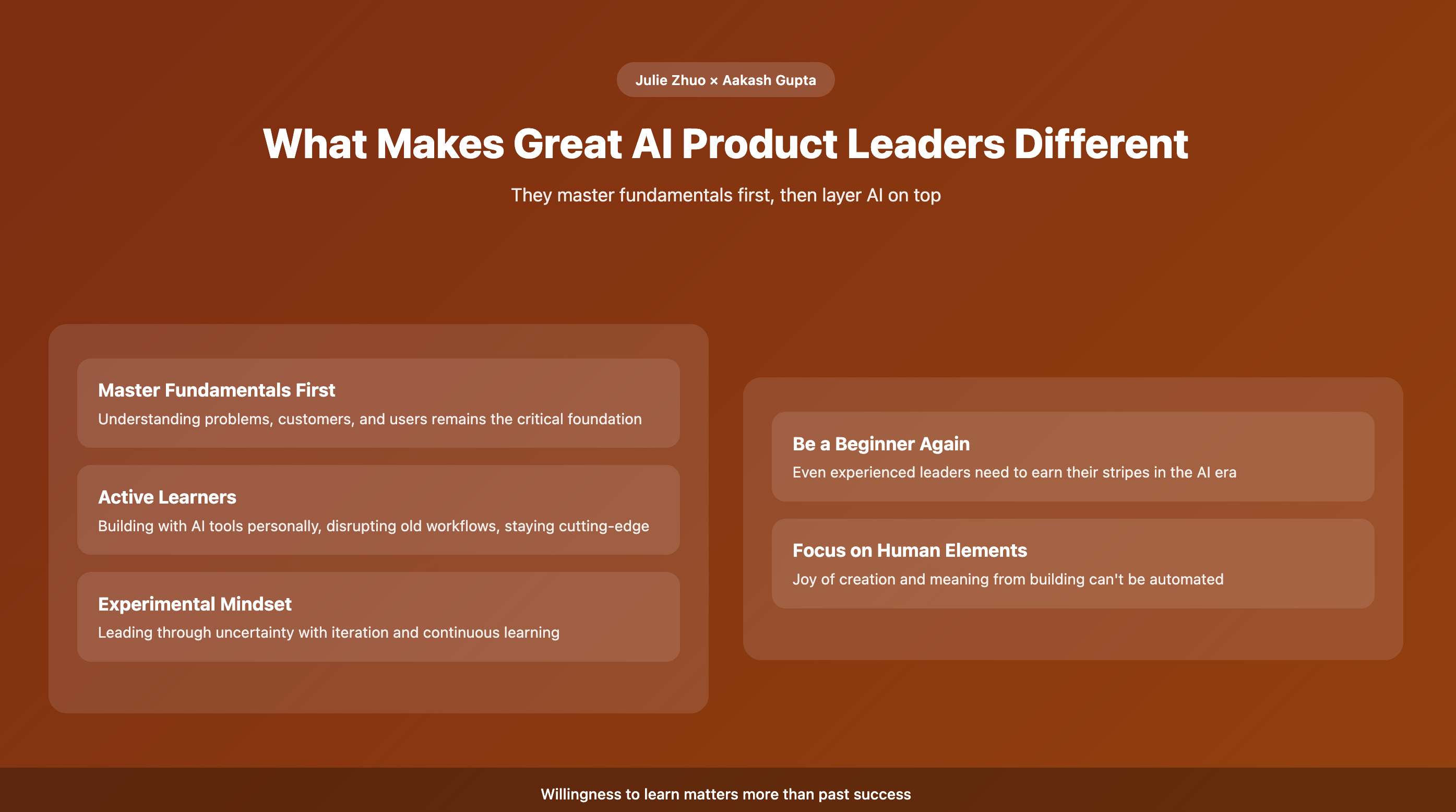 They master the fundamentals first. Understanding the problem, the mission, the customers, the users - these core principles remain true. You can't be a great AI product leader without being a great product leader.