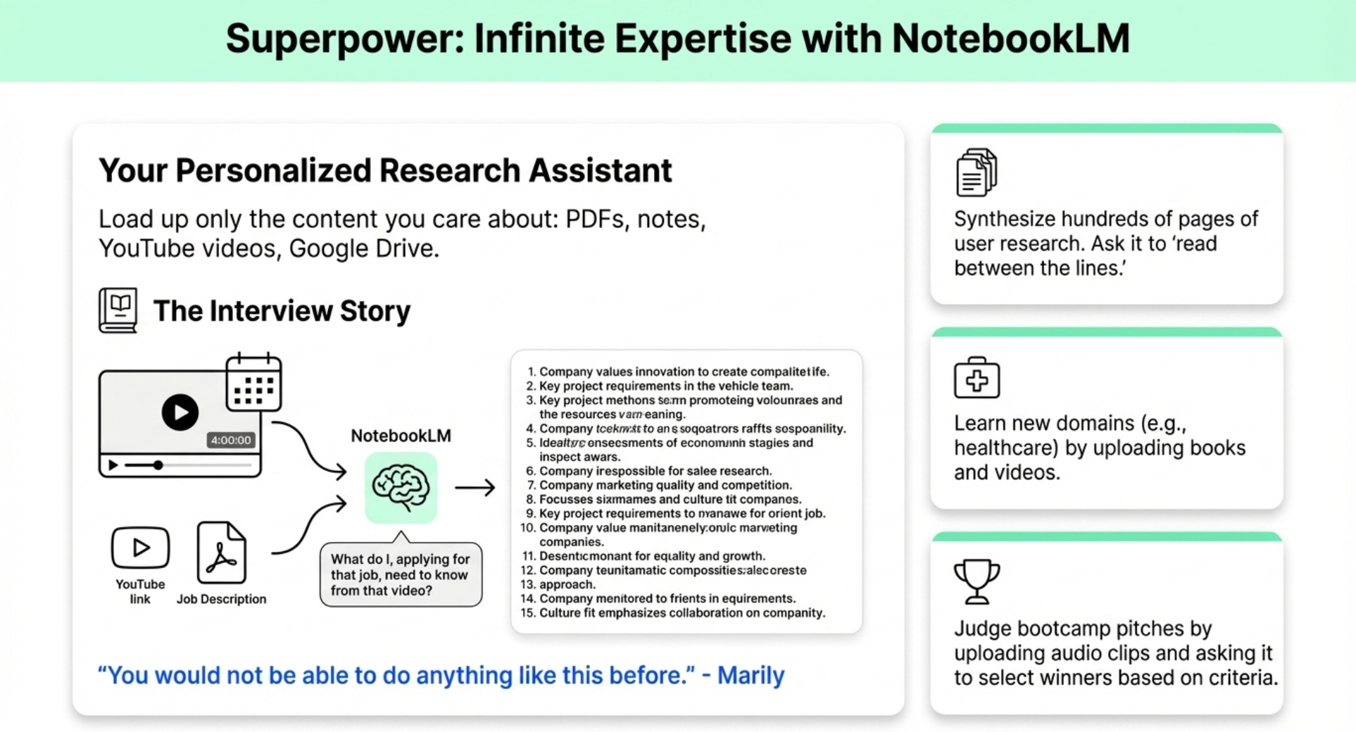 Notebook LM is your personalized research assistant. You load up only the content you care about. PDFs, handwritten notes, YouTube videos, websites, a Google Drive.