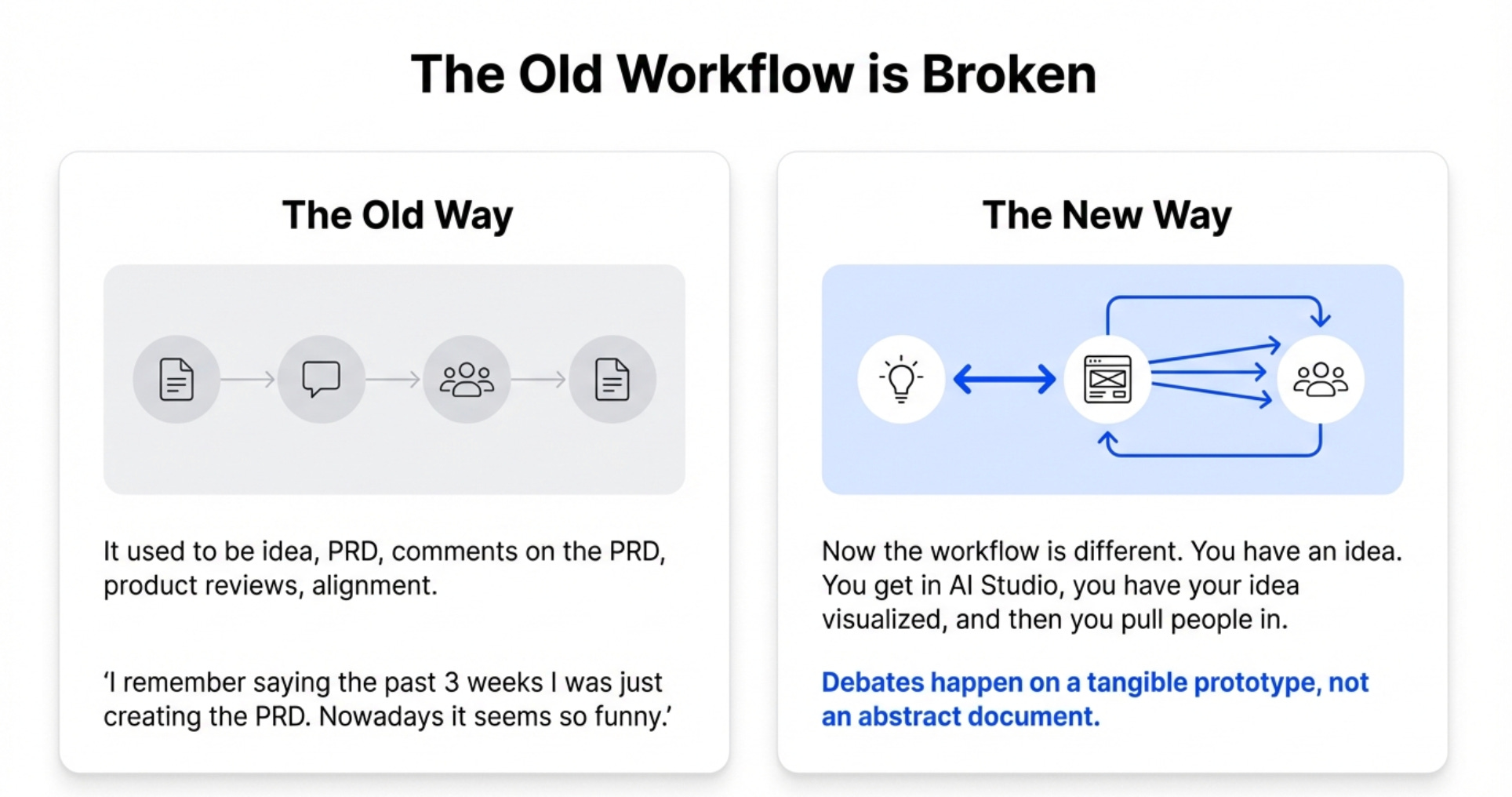 You have an idea. You don’t need to reach out to anyone yet. You don’t need to write a PRD. You get in AI Studio, you have your idea visualized, and then you pull people in.