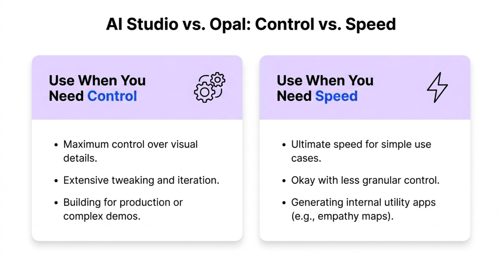 Use AI Studio when you want maximum control. When you need to tweak visual details extensively. When you’re building something for production.