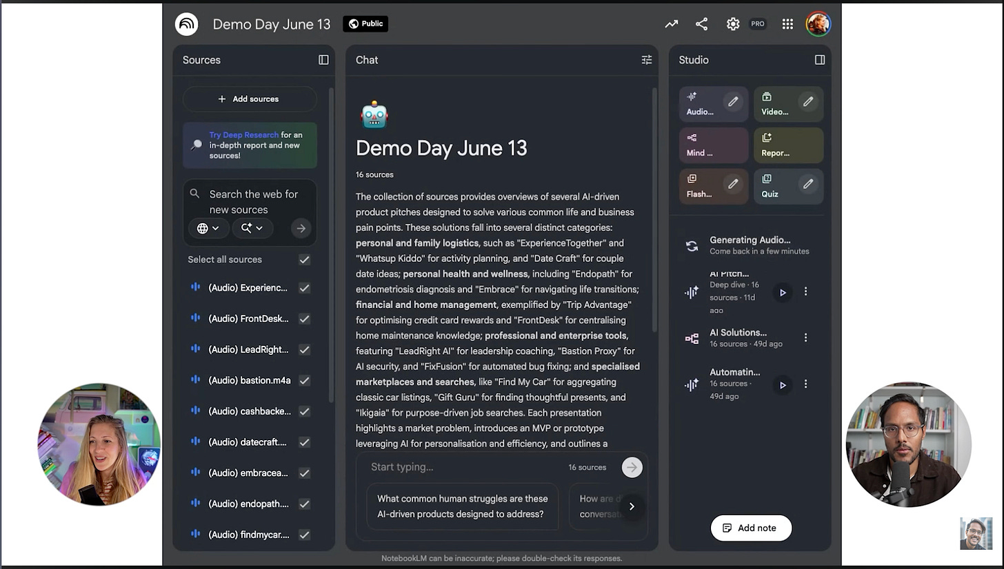She uploads the audio clips to Notebook LM. Then she goes to audio overview and says you are judges of Marily Nika AI PM Bootcamp and here are all the pitches. You need to select the top two based on creativity, impact, and simply better storytelling.